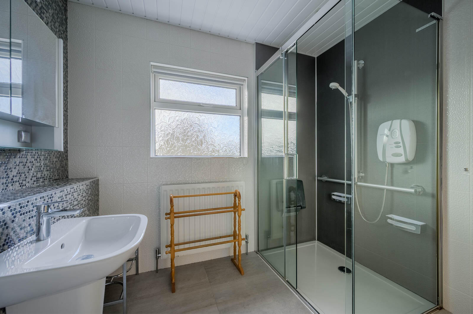 .Contemporary Family Shower Room Boasting a Walk-In Enclosure, Modern Sanitary Ware, Mosaic Tiling, and Chrome Fittings, Finished to a High Standard of Specification.