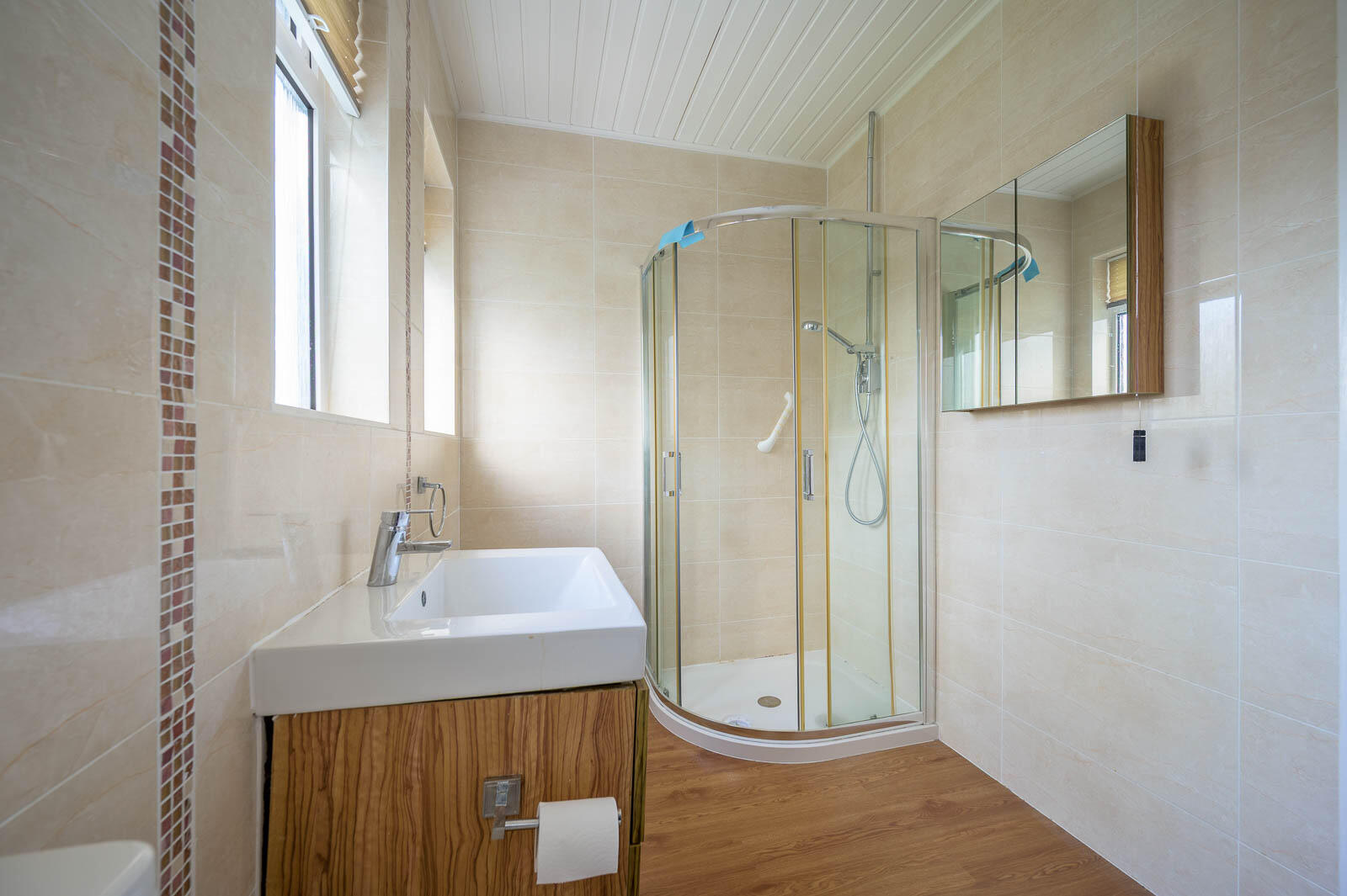 Shower Room: - Modern white suite comprising corner shower cubicle with thermostatic shower, vanity unit with drawers and chrome mixer tap, low flush WC, fully tiled walls, tongue and groove ceiling.