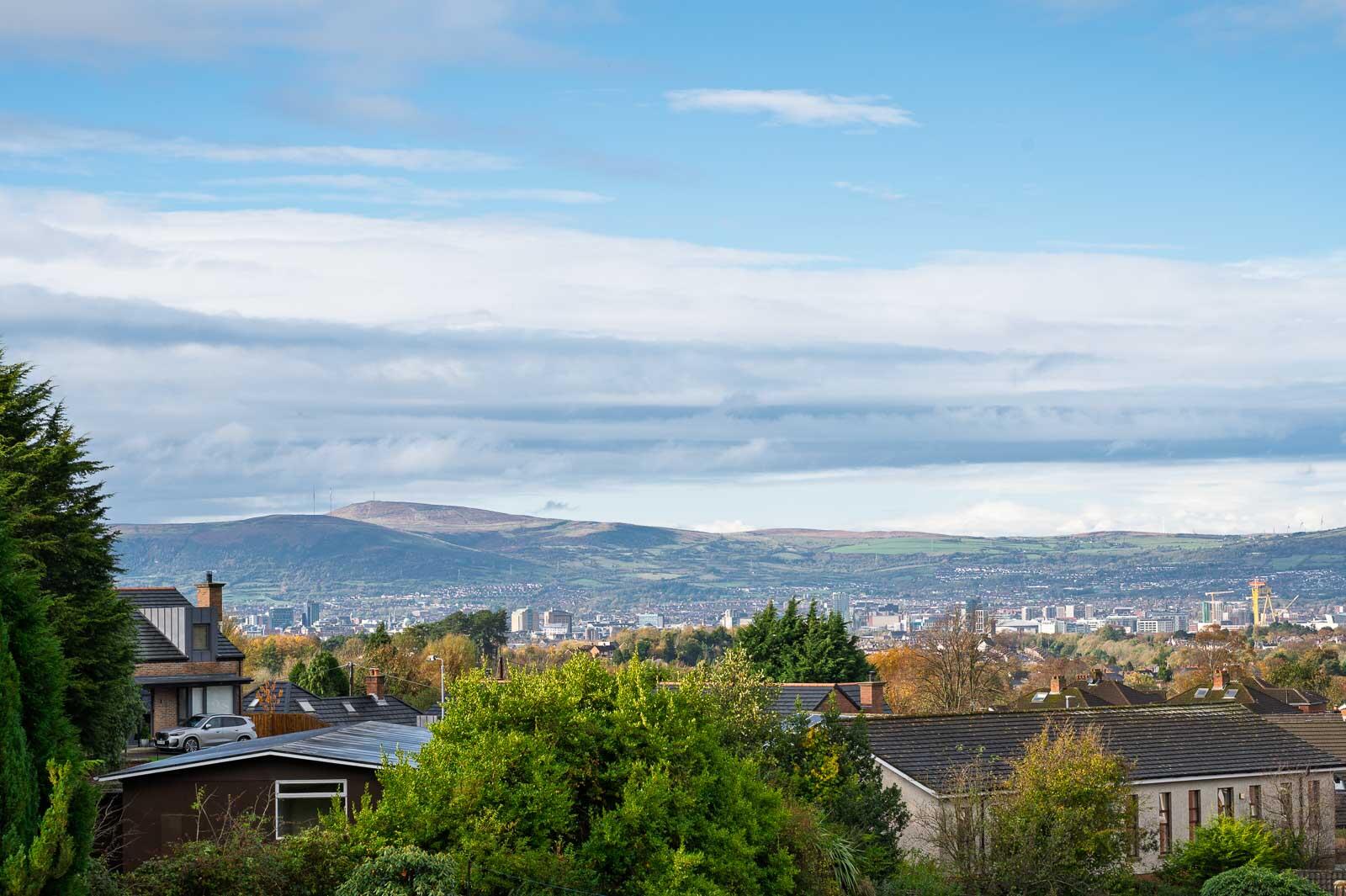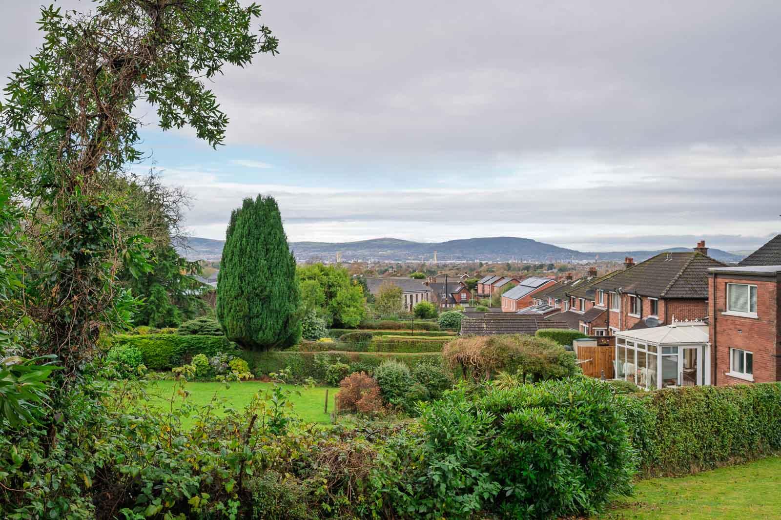Outside: - Tarmac driveway to front leading to attached garage, gardens to front in lawn with mature shrubs, excellent garden to rear in lawns with paved patio areas, mature shrubs, trees, bushes, plants, excellent views across Belfast and surrounding countryside.