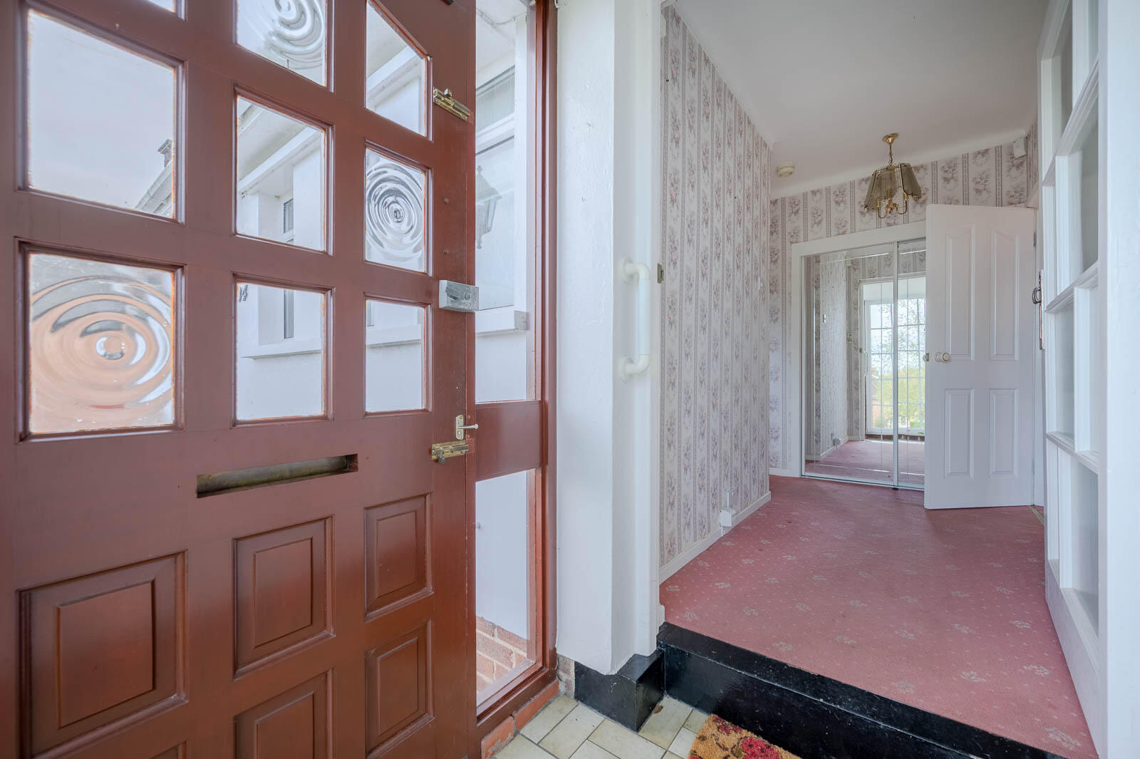 Entrance - Wooden front door with glazed side lights, top light, and insets into entrance porch.