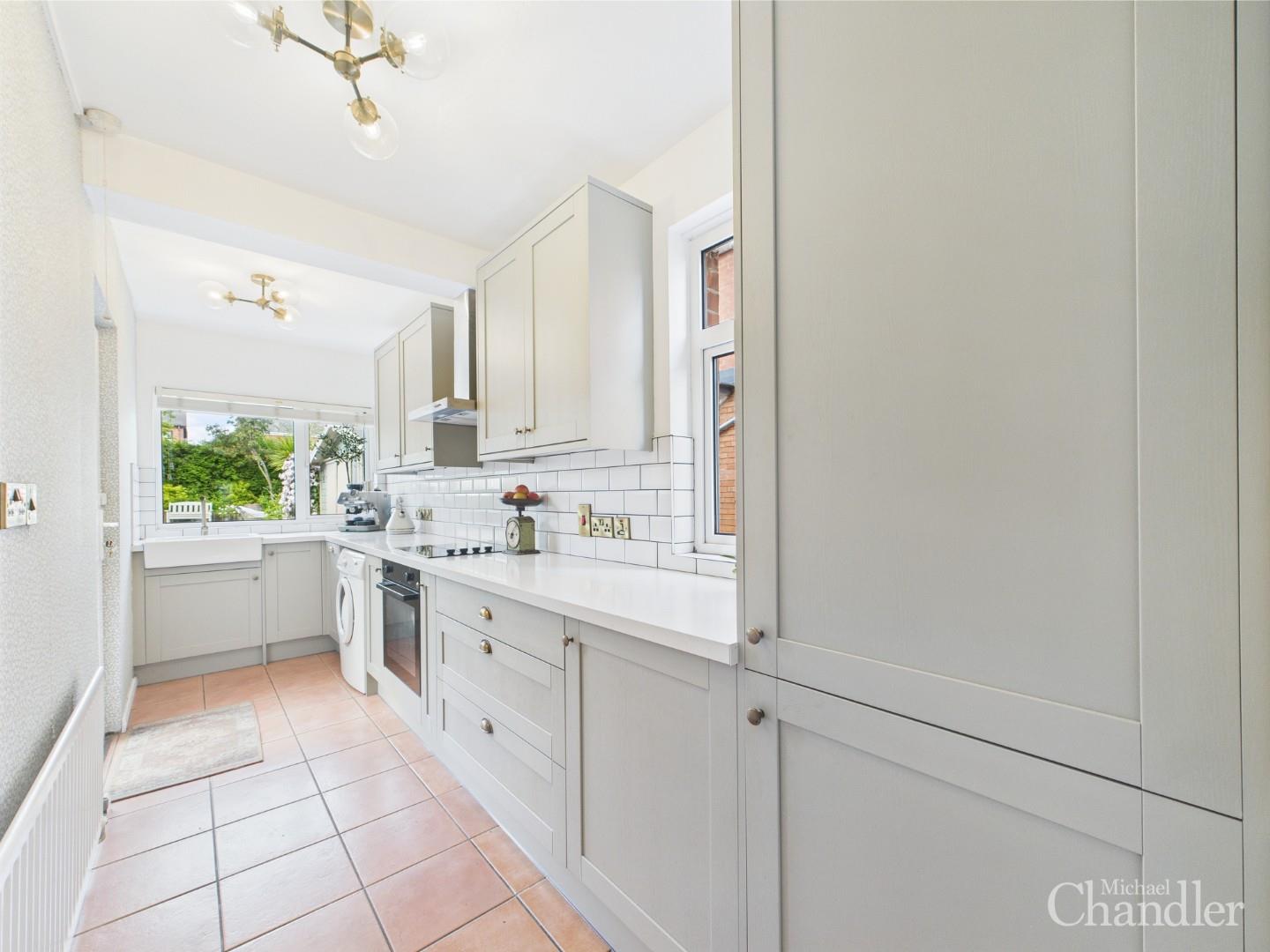 Modern kitchen complete with built-in appliances with views of the large rear garden