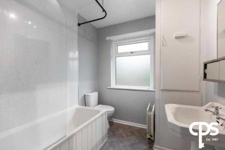 A bright main family bathroom complete with a three-piece white suite including a wash hand basin, WC, and a shower over bath. The bathroom benefits from vinyl flooring and a panelled surround for easy maintenance.