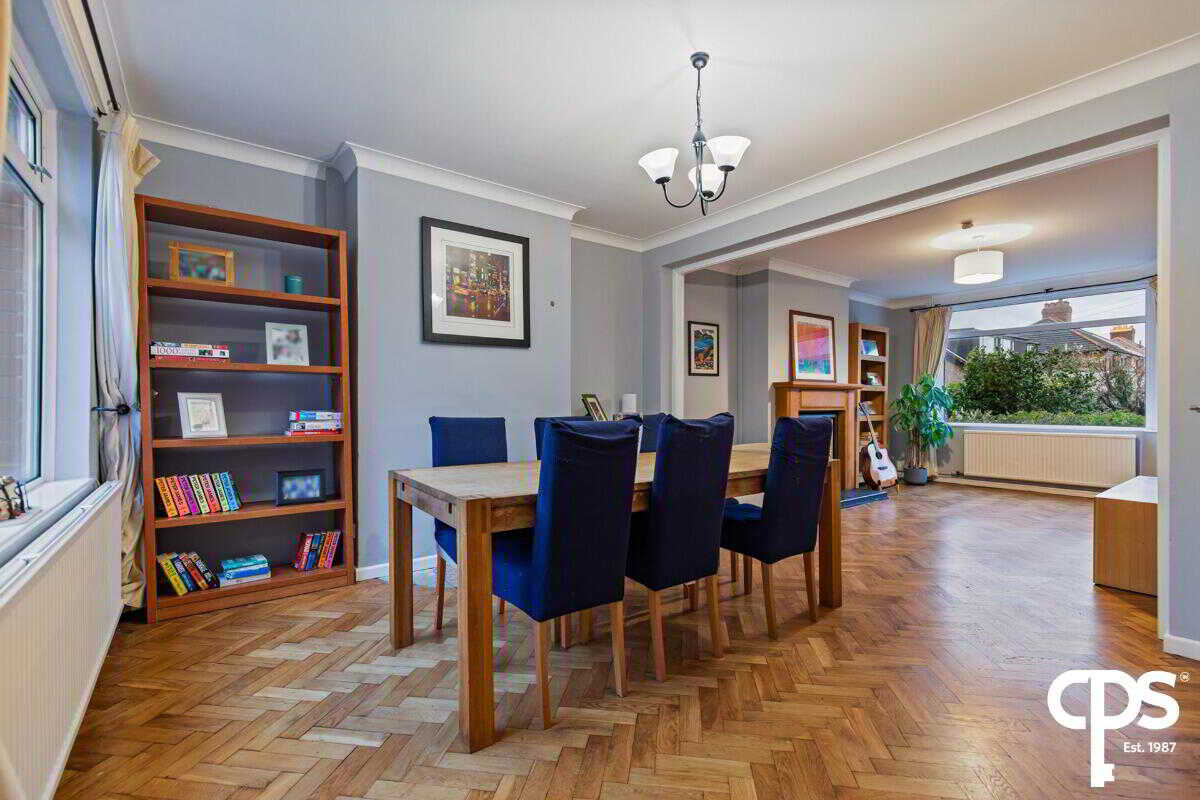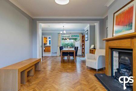 Spacious living/dining room with parquet flooring, feature fireplace with solid wood mantle and large windows allowing ample natural light through the room.