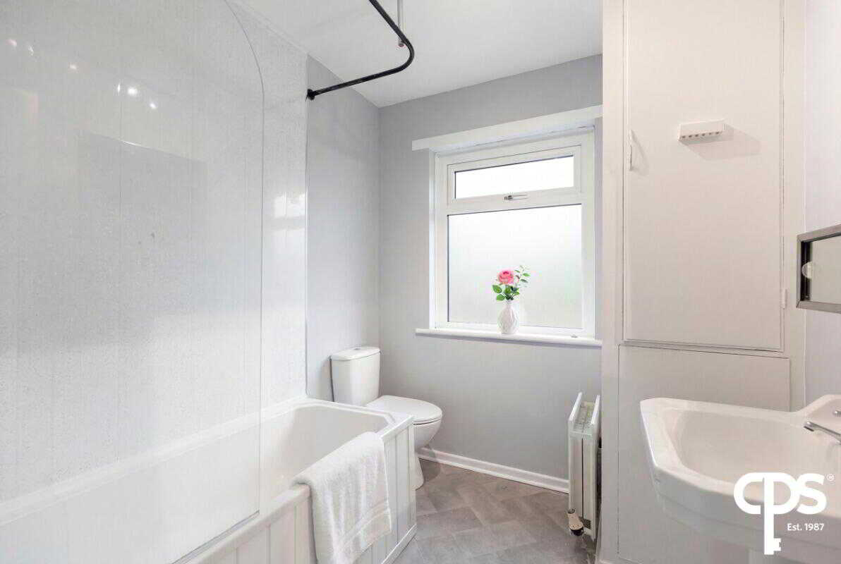 A bright main family bathroom complete with a three-piece white suite including a wash hand basin, WC, and a shower over bath. The bathroom benefits from vinyl flooring and a panelled surround for easy maintenance.