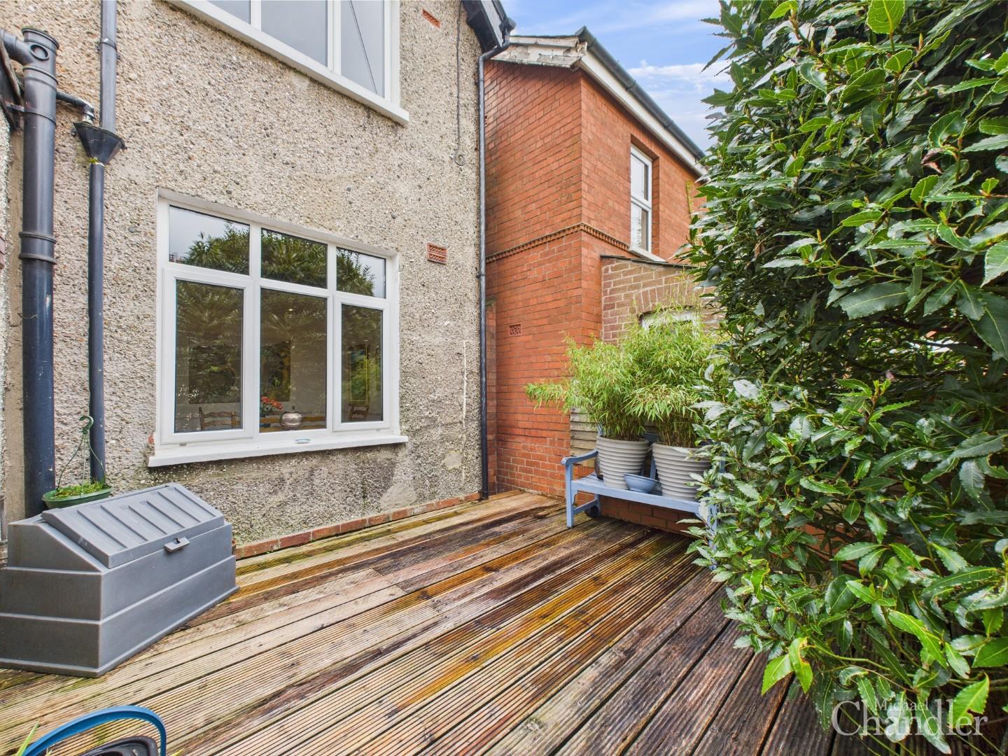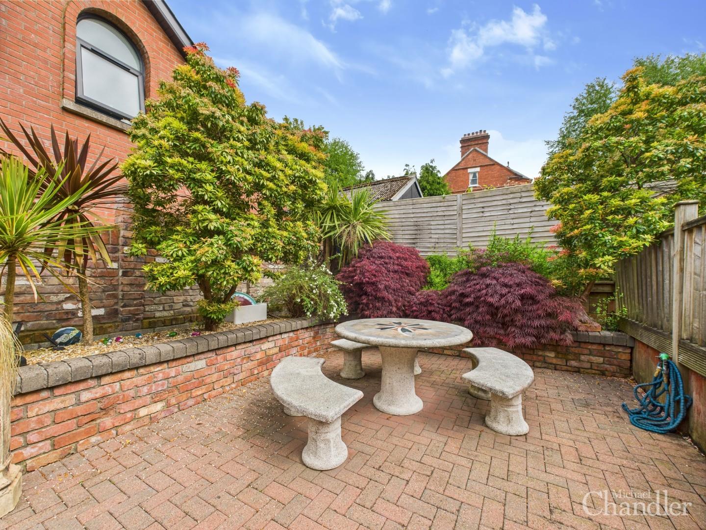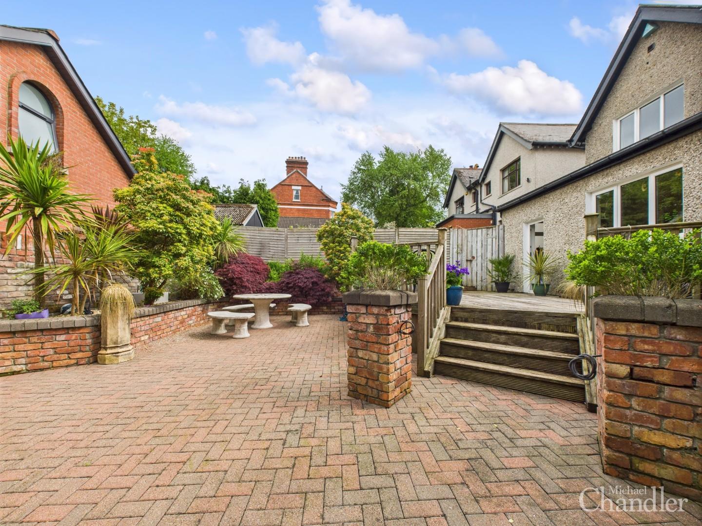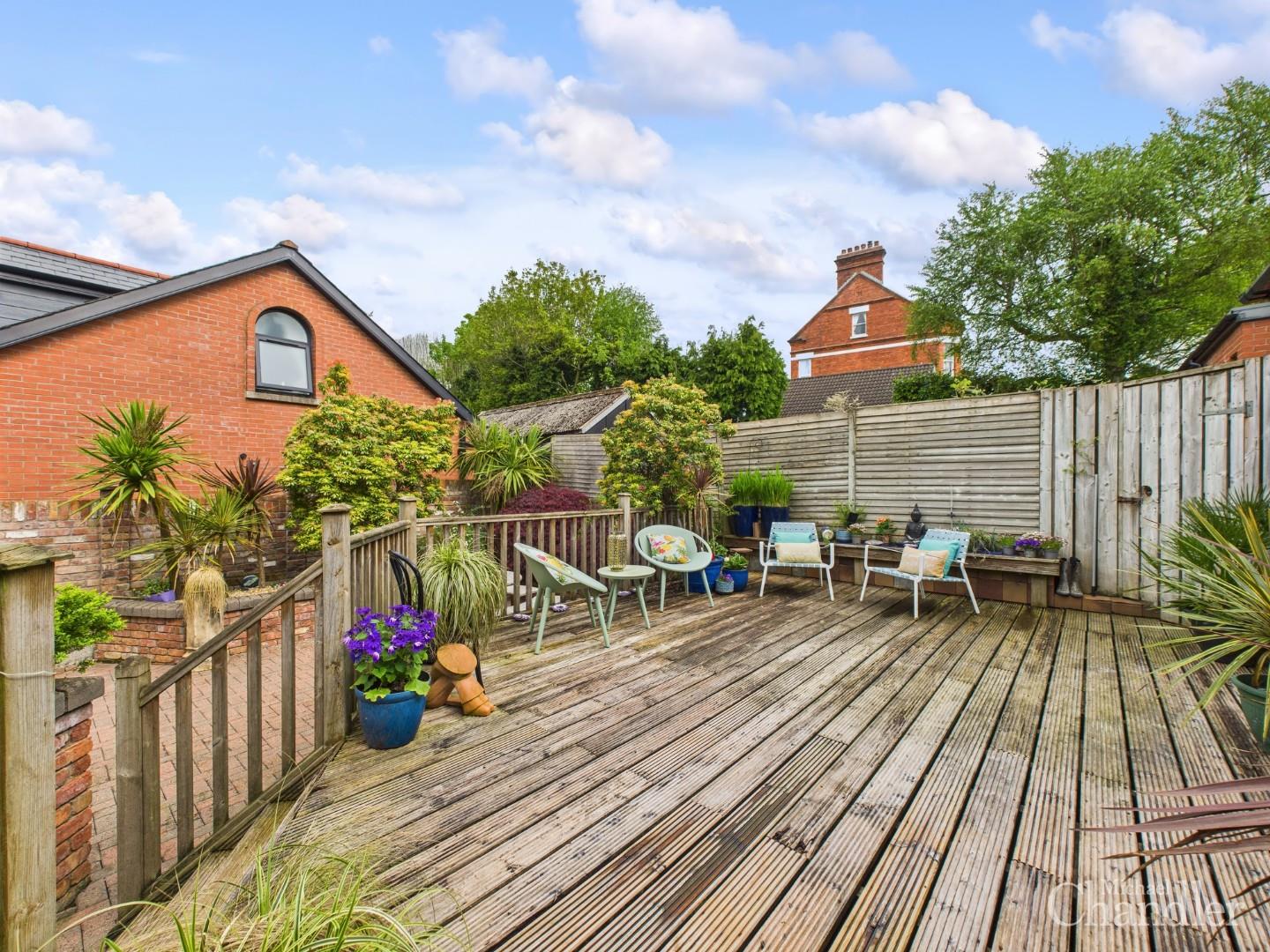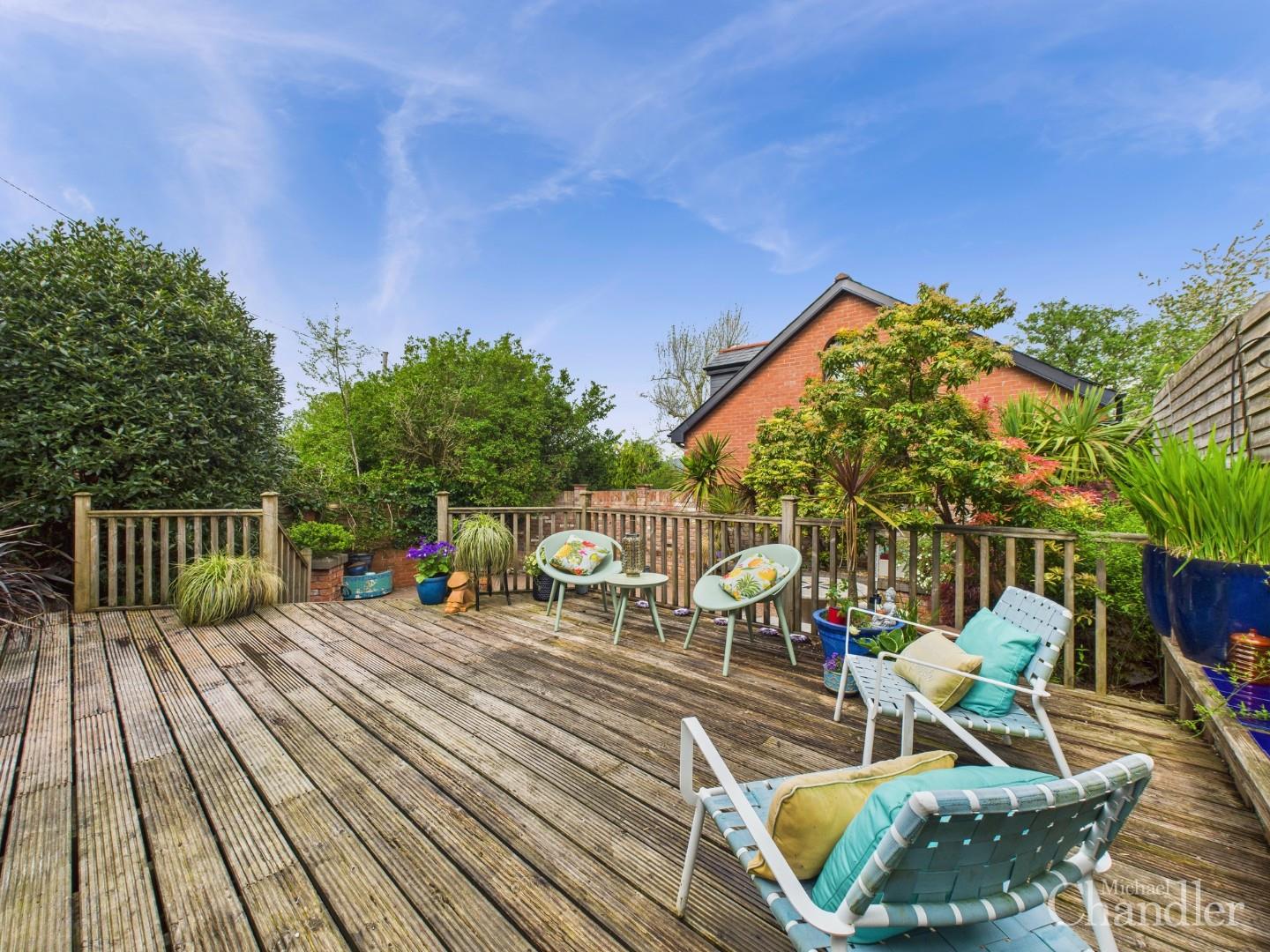 Superb rear garden with a Tobermore brick paved patio and raised decking
