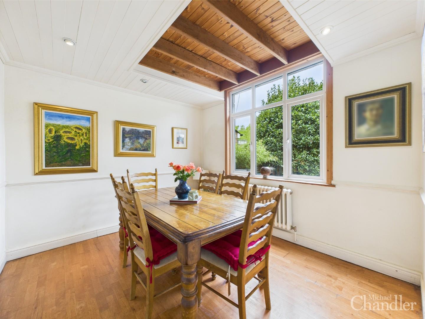 Formal dining room with garden views and a wooden ceiling with spot lighting