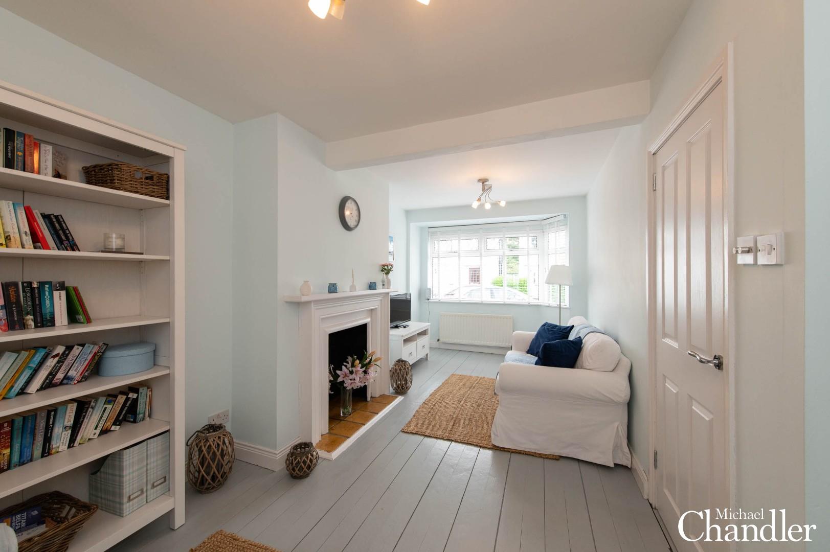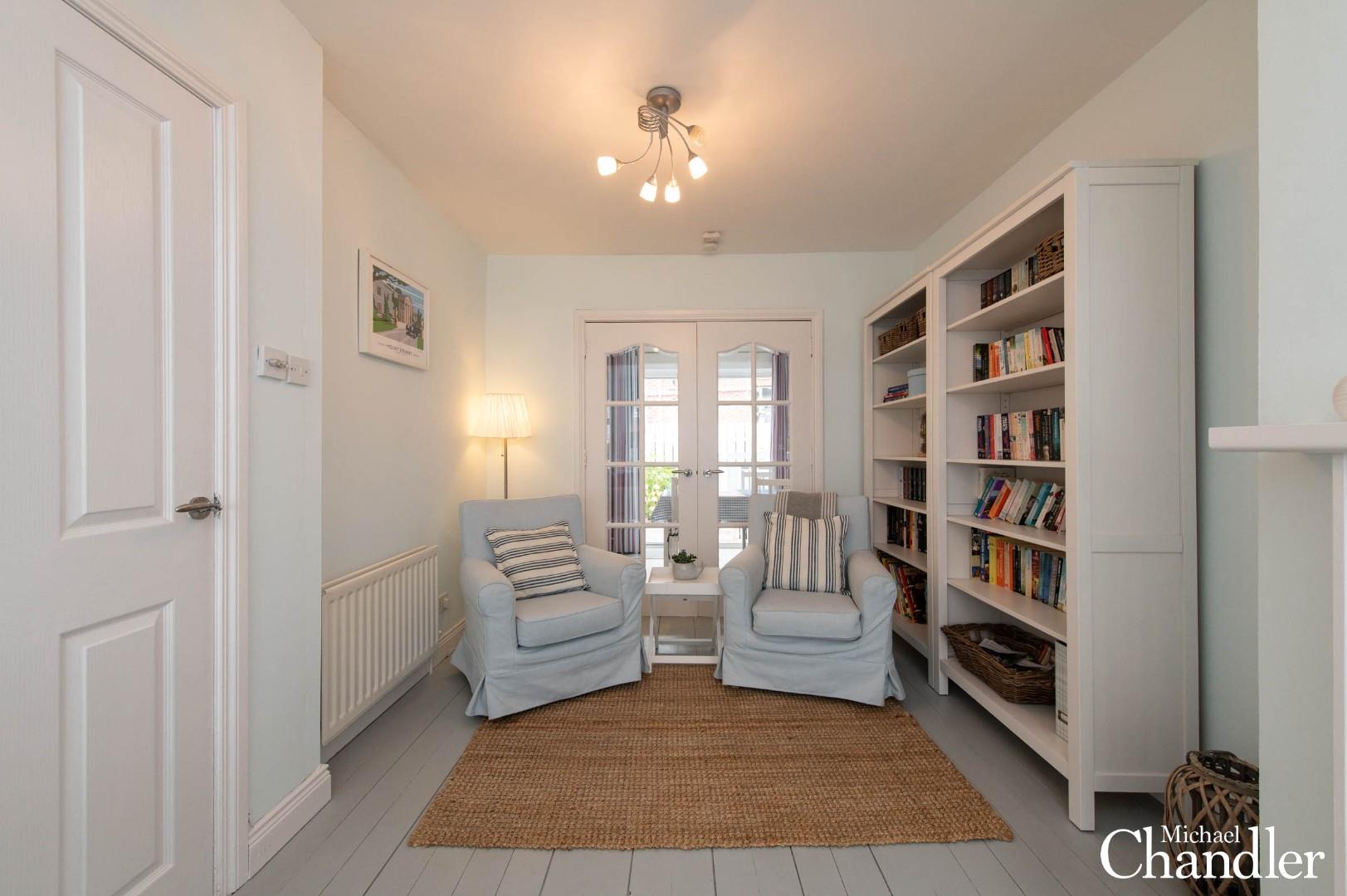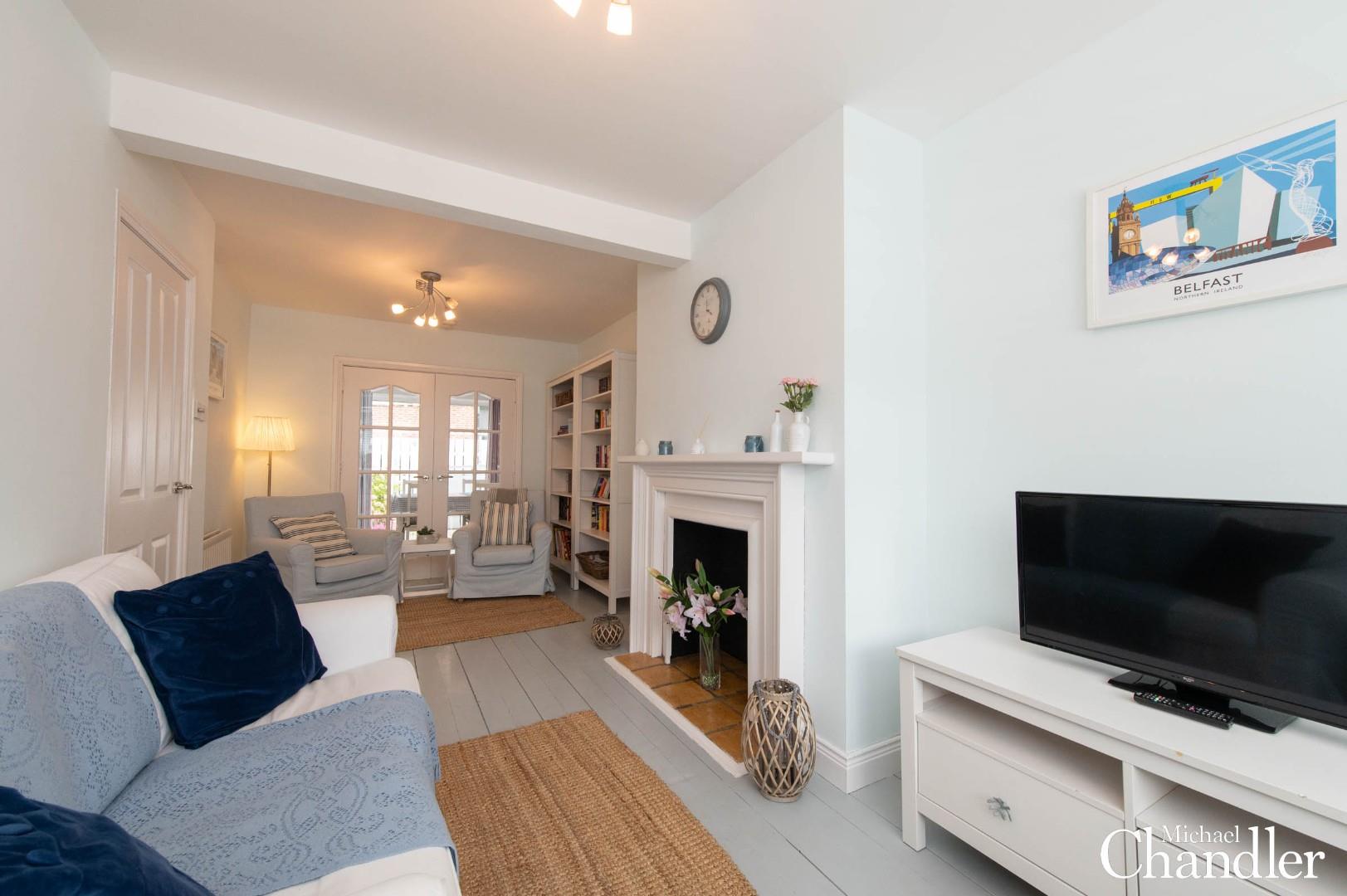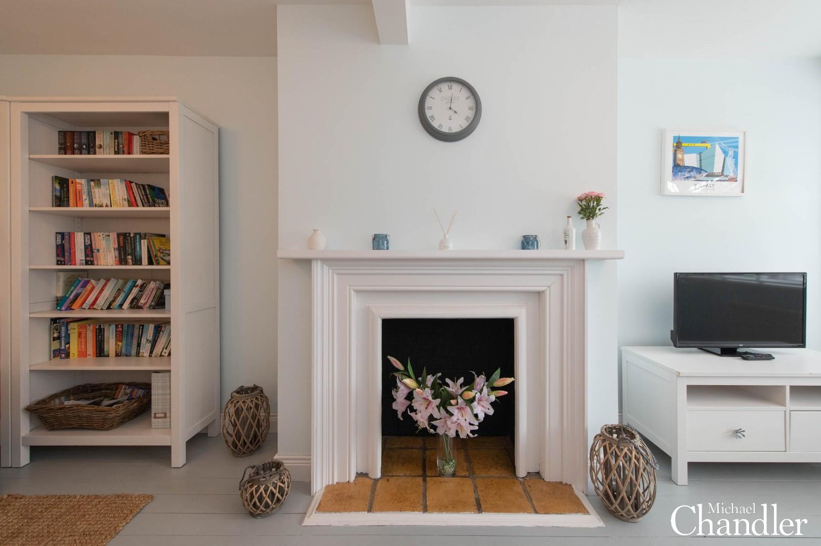 Stunning living room with a feature fireplace with an open plan dining or reading area