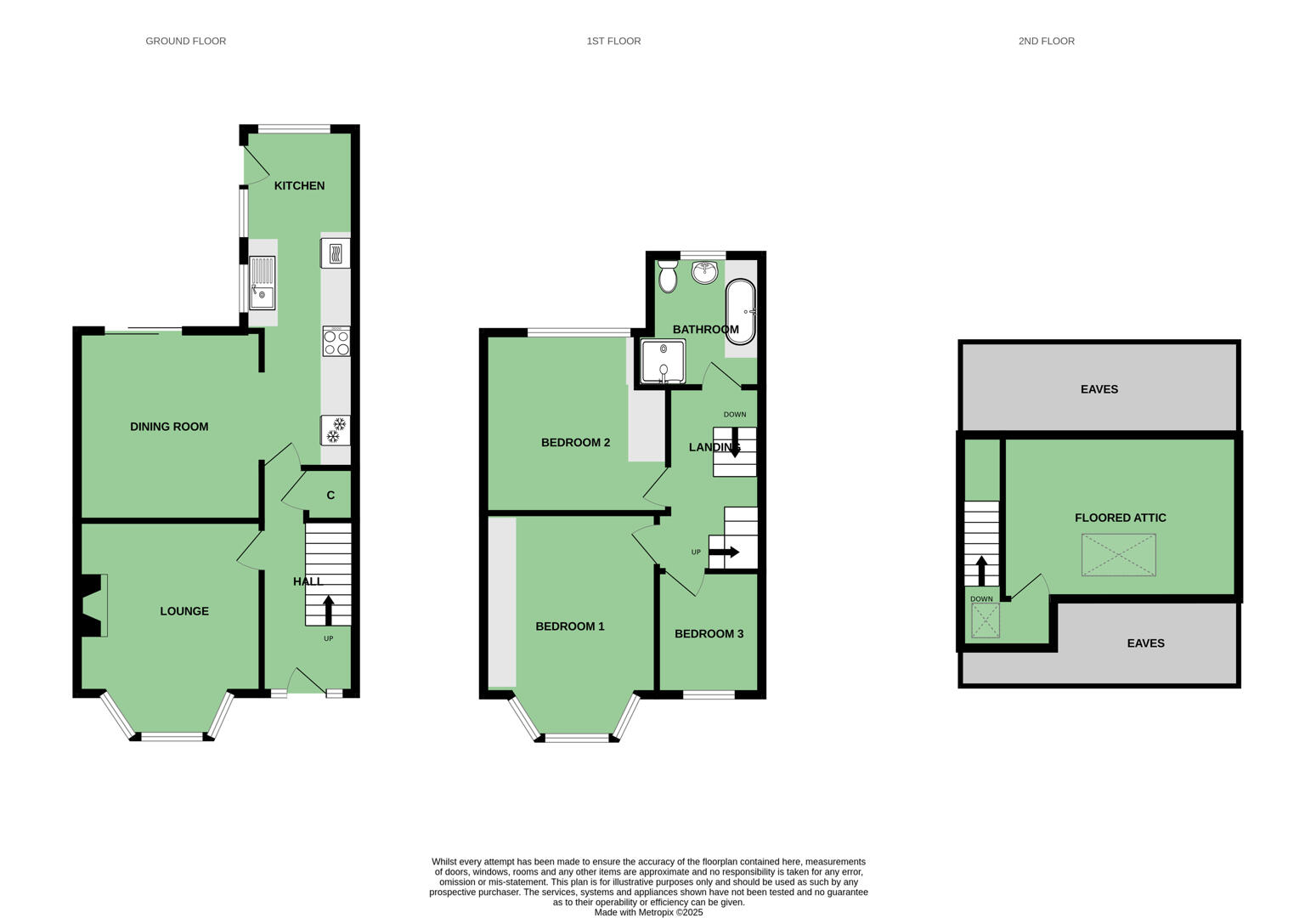 The property itself offers generous accommodation over ground and first floor comprising of front lounge and a bespoke fitted kitchen open to ample dining space and an additional living room. To the first floor, there are three well-proportioned bedrooms and a family bathroom with white suite. The property further benefits from a fixed staircase to a fully floored and sheeted roof space, gas fired central heating and UPVC double glazing throughout. To the exterior of the property there is a tarmacked driveway with generous off-street parking leading to a linked detached garage and an enclosed private rear garden ideal for outdoor entertaining and children at play.