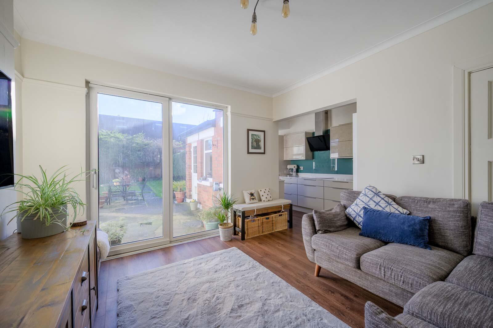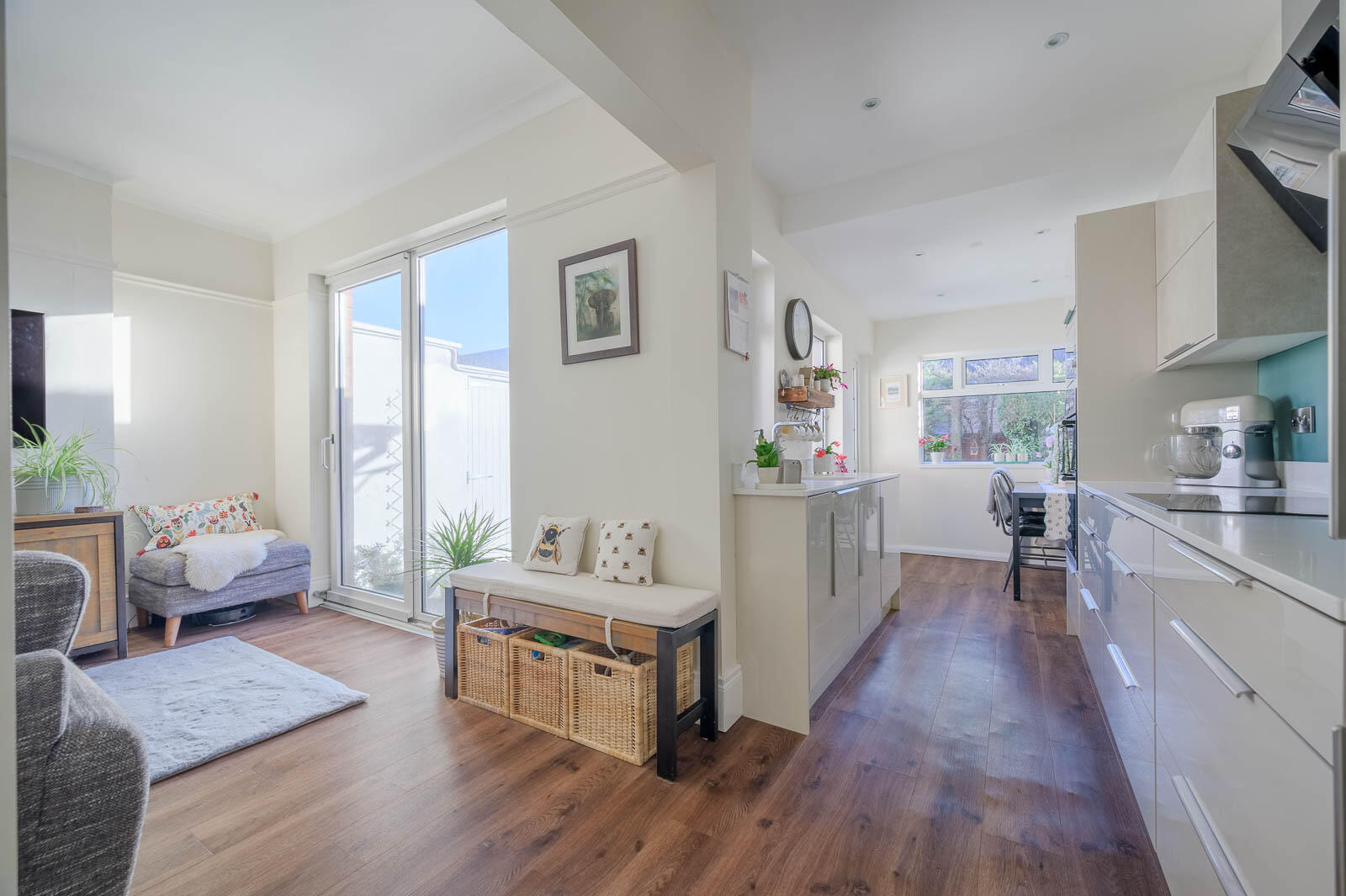 Kitchen Open Plan To Living And Dining: - 12'1" x 11'9" - Kitchen with excellent range of high and low level units, stainless steel fittings, quartz worktop, stainless steel sink inset and chrome mixer tap, integrated washing machine, integrated dishwasher, integrated fridge freezer, four ring induction hob and extractor hood above, glass splashback, built-in double oven and integrated microwave, low voltage recessed spotlighting, laminate wooden floor, open to ample dining space, modern vertical radiator, uPVC double glazed access door to rear garden, open to living space, picture rail, cornice ceiling, uPVC double glazed sliding door to rear garden.