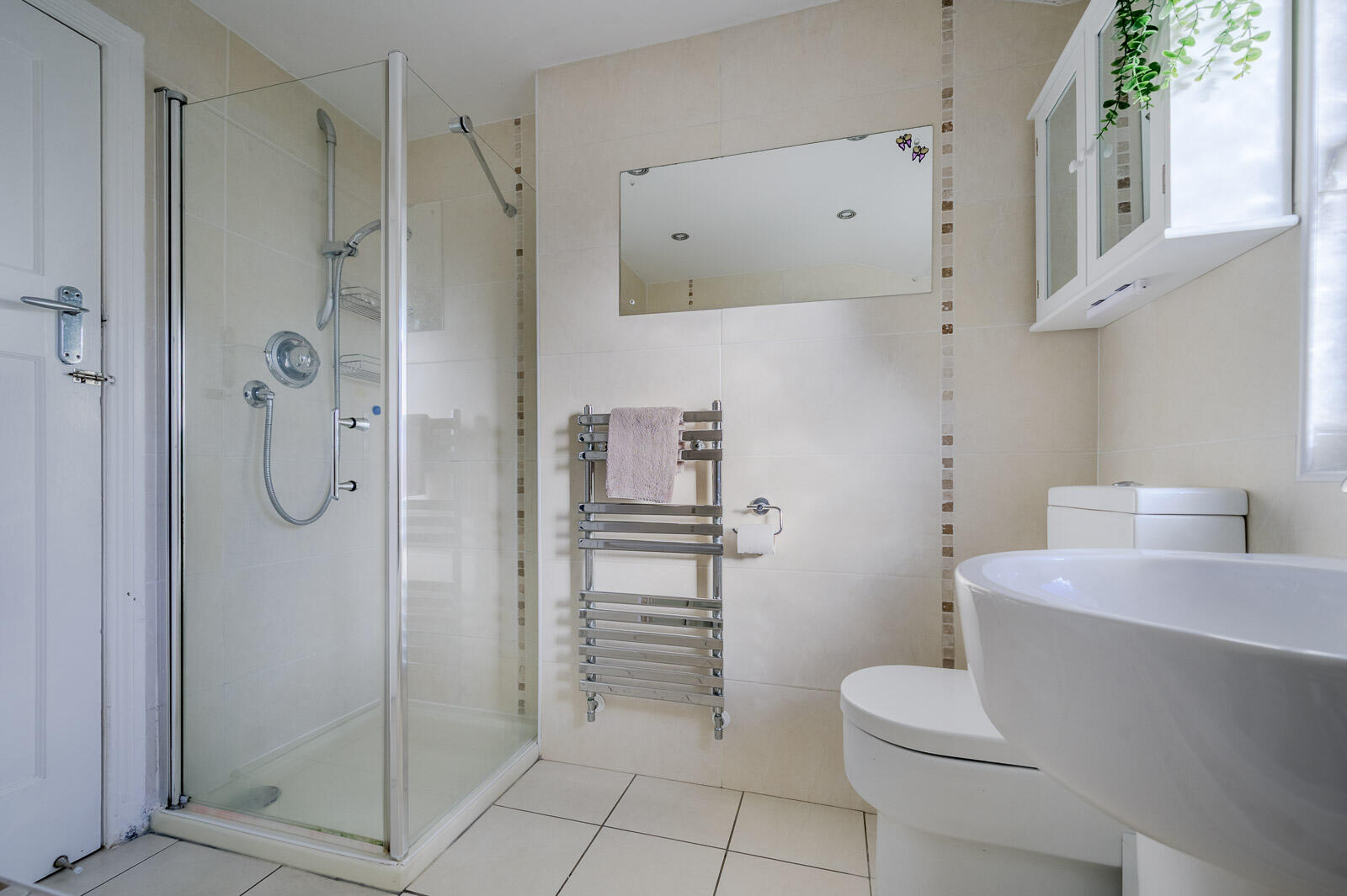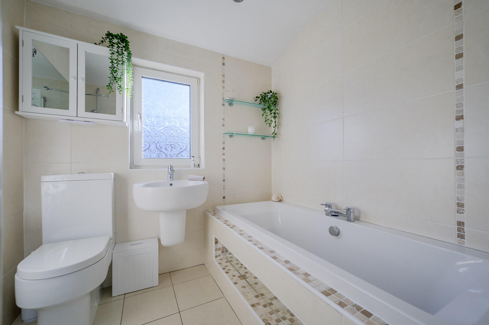 Family Bathroom: - Modern white suite comprising low flush WC with push button, floating wash hand basin with chrome mixer tap, tiled panelled bath with chrome mixer taps, fully tiled shower cubicle with thermostatically controlled valve and telephone hand unit, ceramic tiled floor, chrome heated towel rail, low voltage recessed spotlighting, fully tiled walls, frosted glass window, built-in storage cupboard with additional shelving.