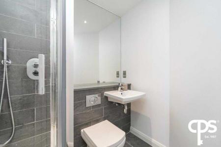 Tiled flooring, enclosed shower cubicle with telephone shower head , low flush wc, wall mounted white hand basin