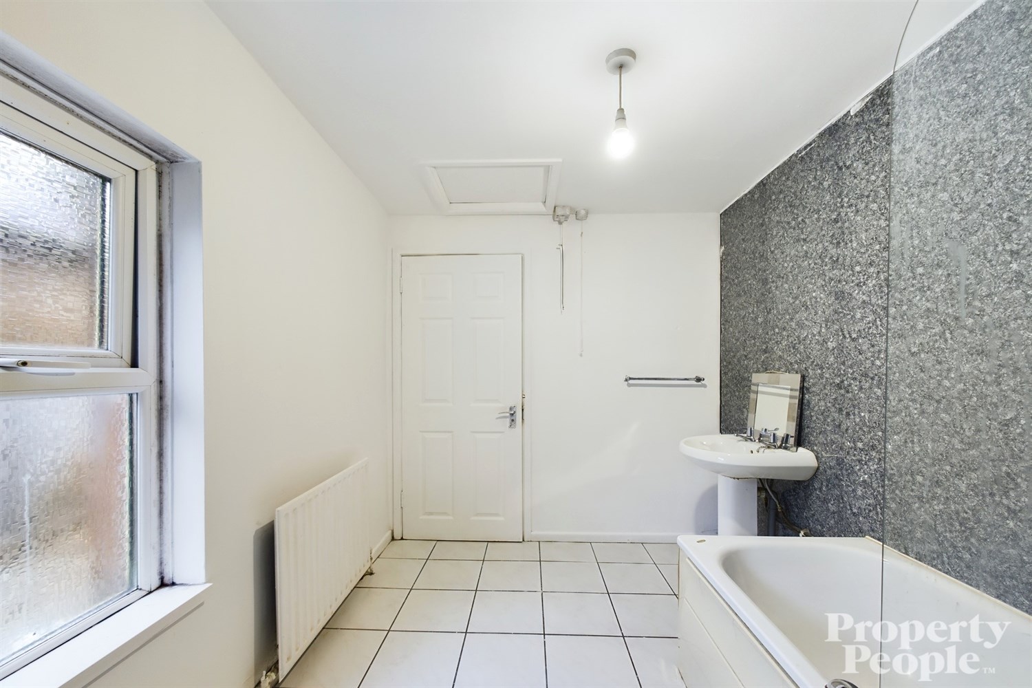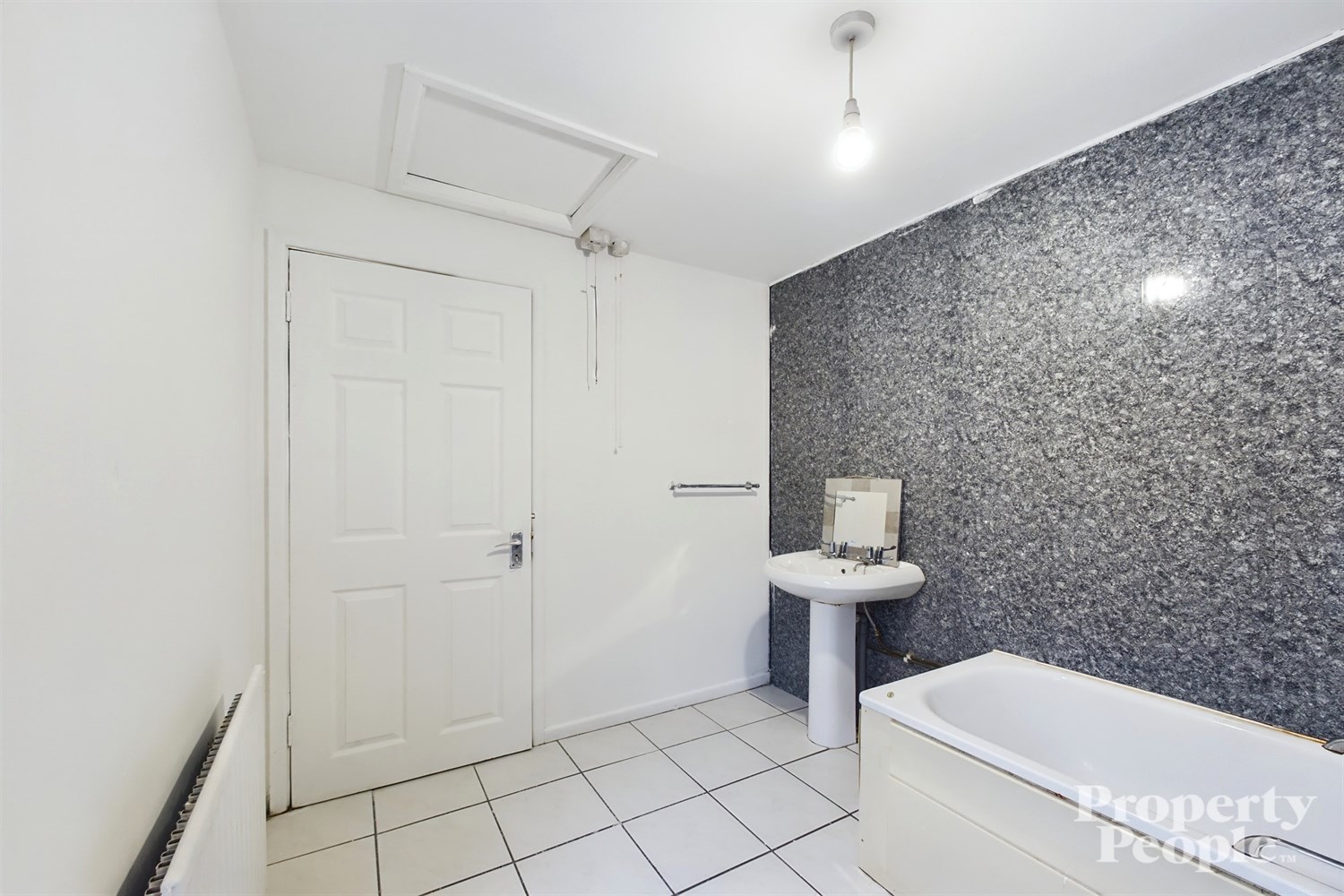 Three-piece white bathroom suite, w.c, wash hand basin with pedestal, panelled bath with electric shower over. Panelled walls, tiled floor and single panel radiator. Roof space storage.