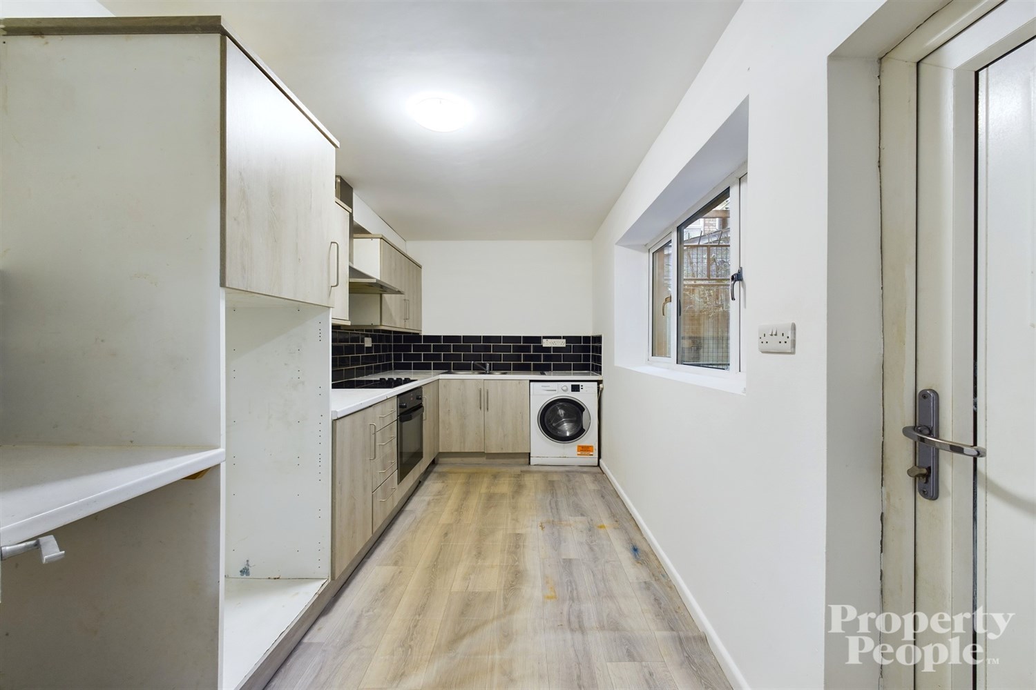 Fitted kitchen with a range of high and low level units, integrated hob and electric oven with stainless steel extractor fan over, stainless steel sink, space for free standing fridge/freezer and plumbed for a washing machine. Breakfast bar area, part tiled walls around worktops, lyno with laminate effect. PVC door for access to rear yard.
