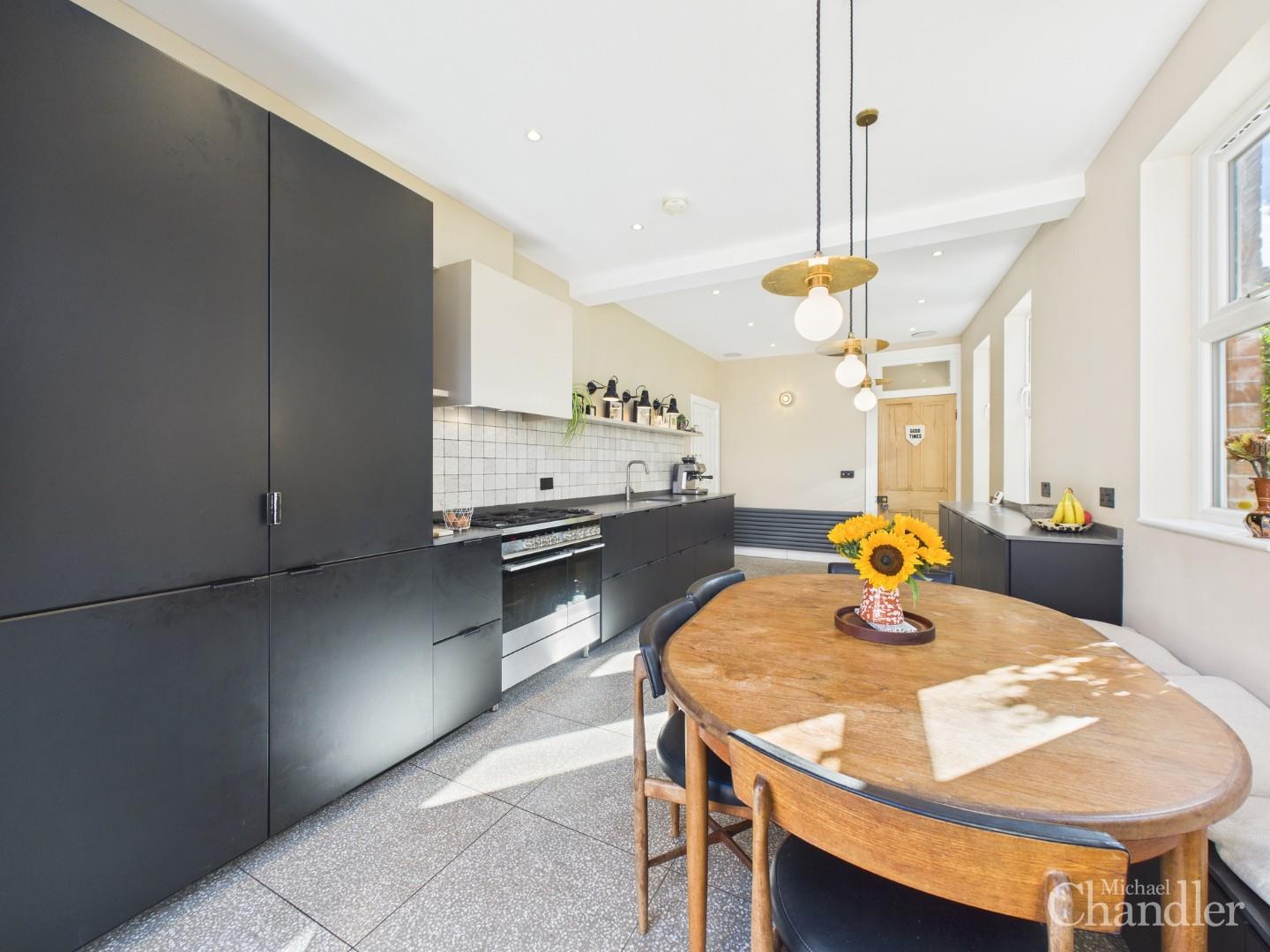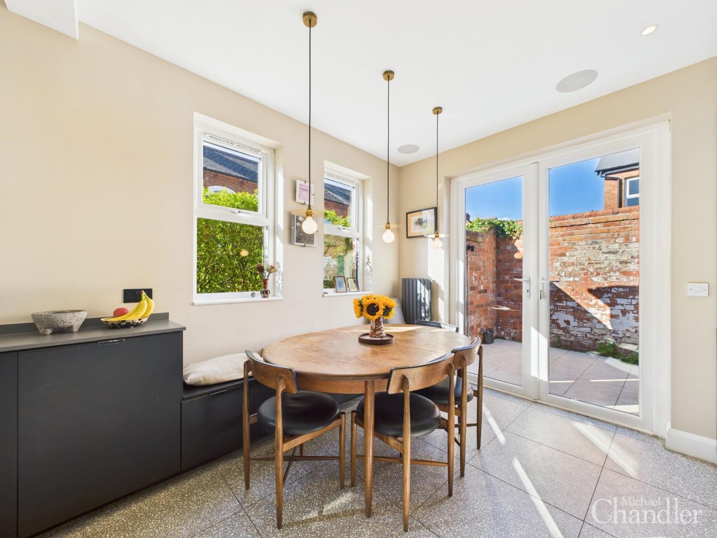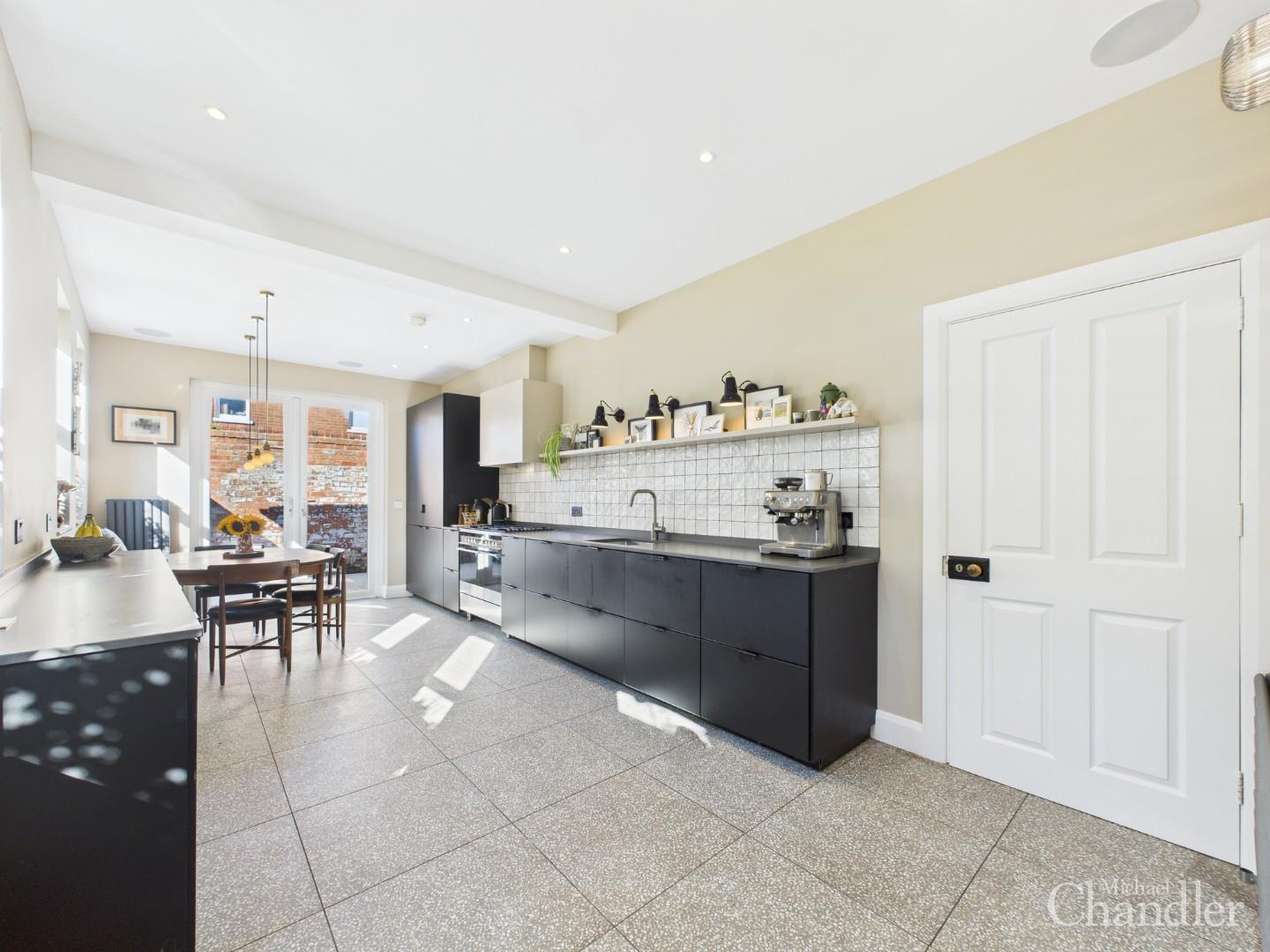 Modern kitchen & dining area with fitted units, built in appliances & double doors to the courtyard