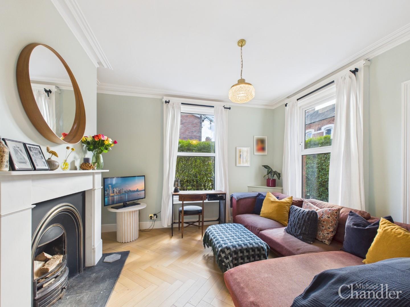 Cosy living room benefitting from a stunning feature fireplace and dual aspect windows