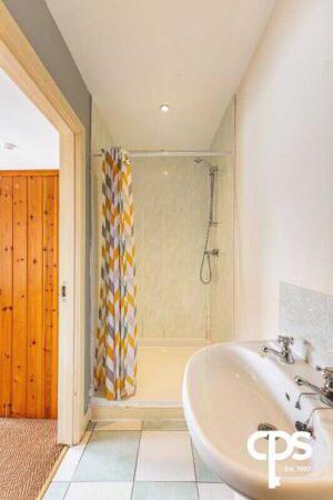 White suite comprising with W.C., wash hand basin, walk-in fully tiled shower cubicle, part-tiled walls and tiled floor.