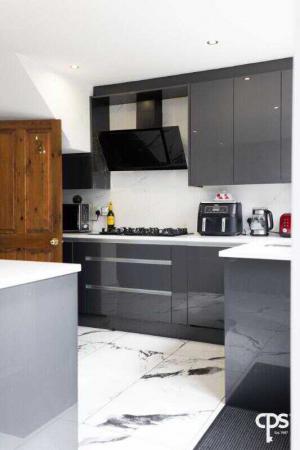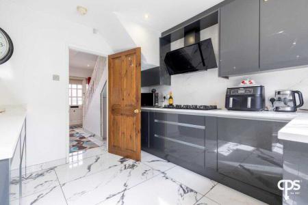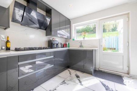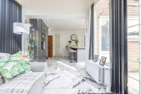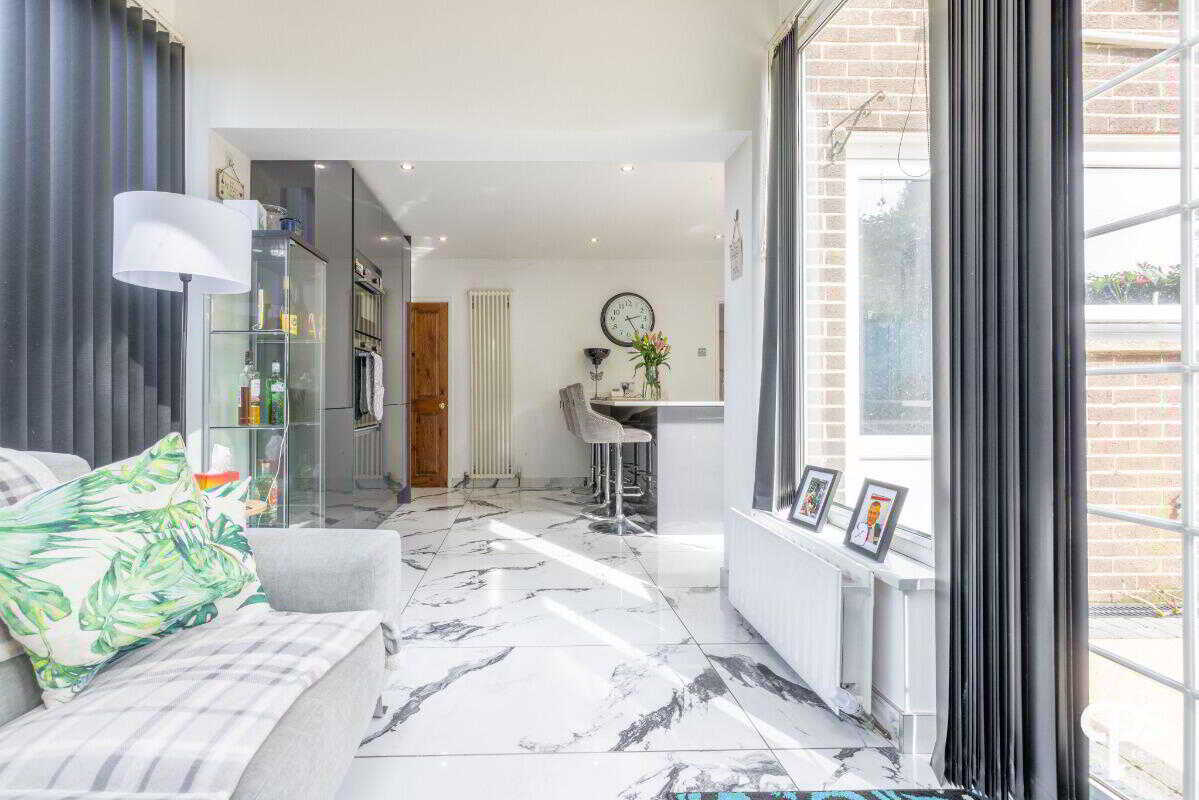 The space opens seamlessly into the dining and living area, with large patio doors leading to the rear garden.