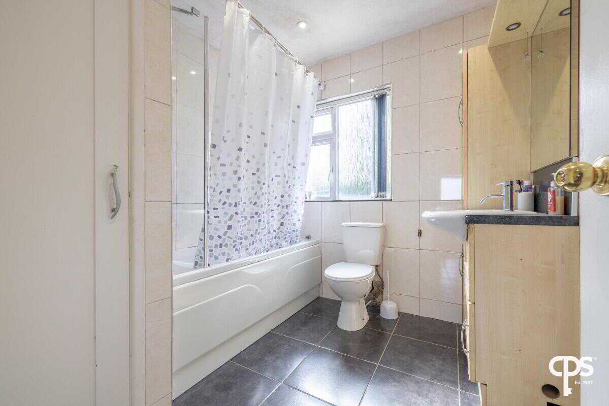 Contemporary family bathroom fitted with a white suite including bath with overhead shower, wash hand basin and low flush WC. Finished with tiled flooring and partially tiled walls.