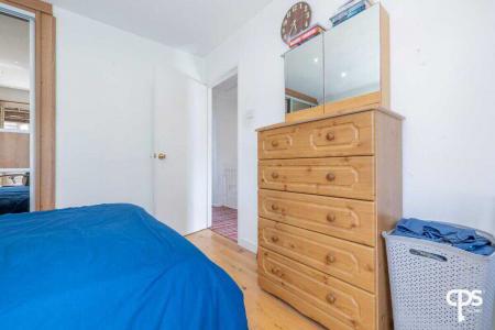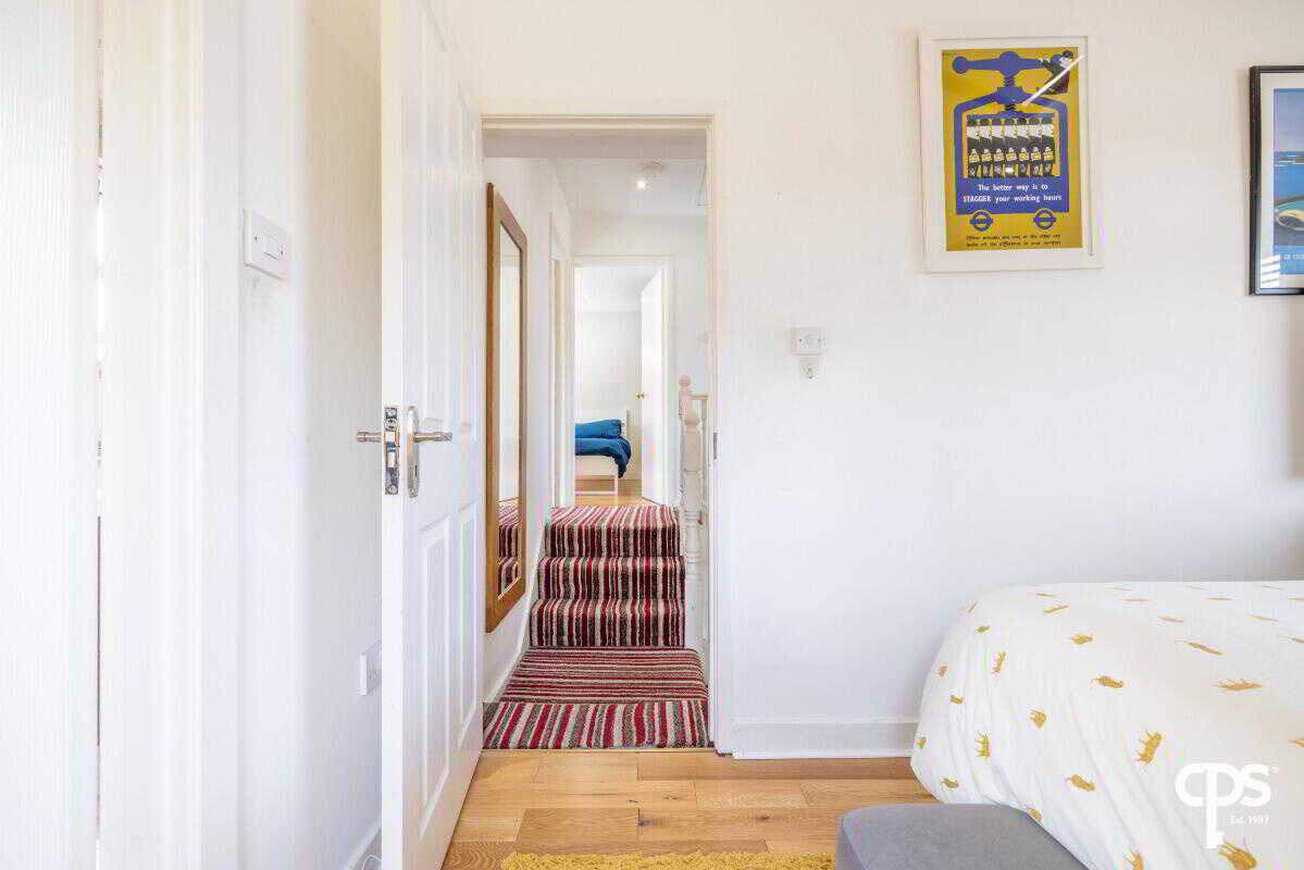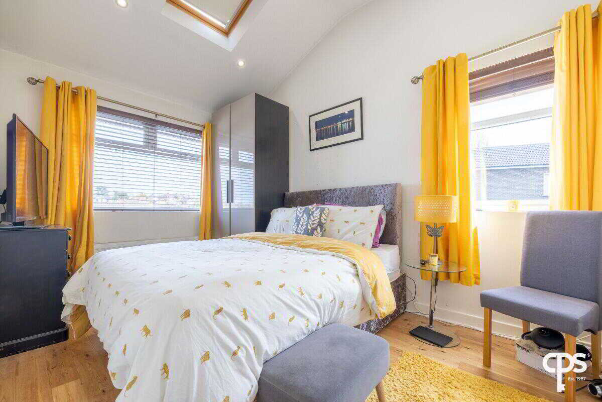 Generous double bedroom, featuring wood-effect flooring and excellent natural light, further enhanced by a skylight.