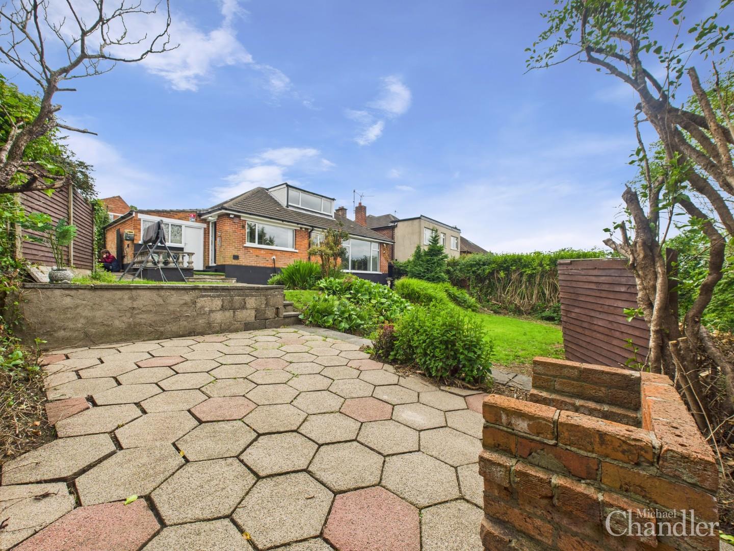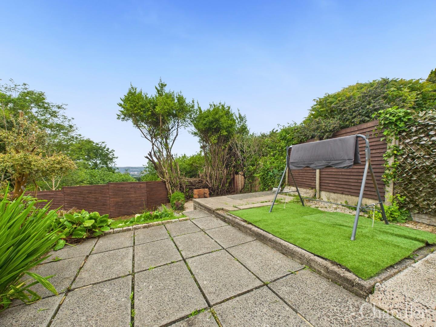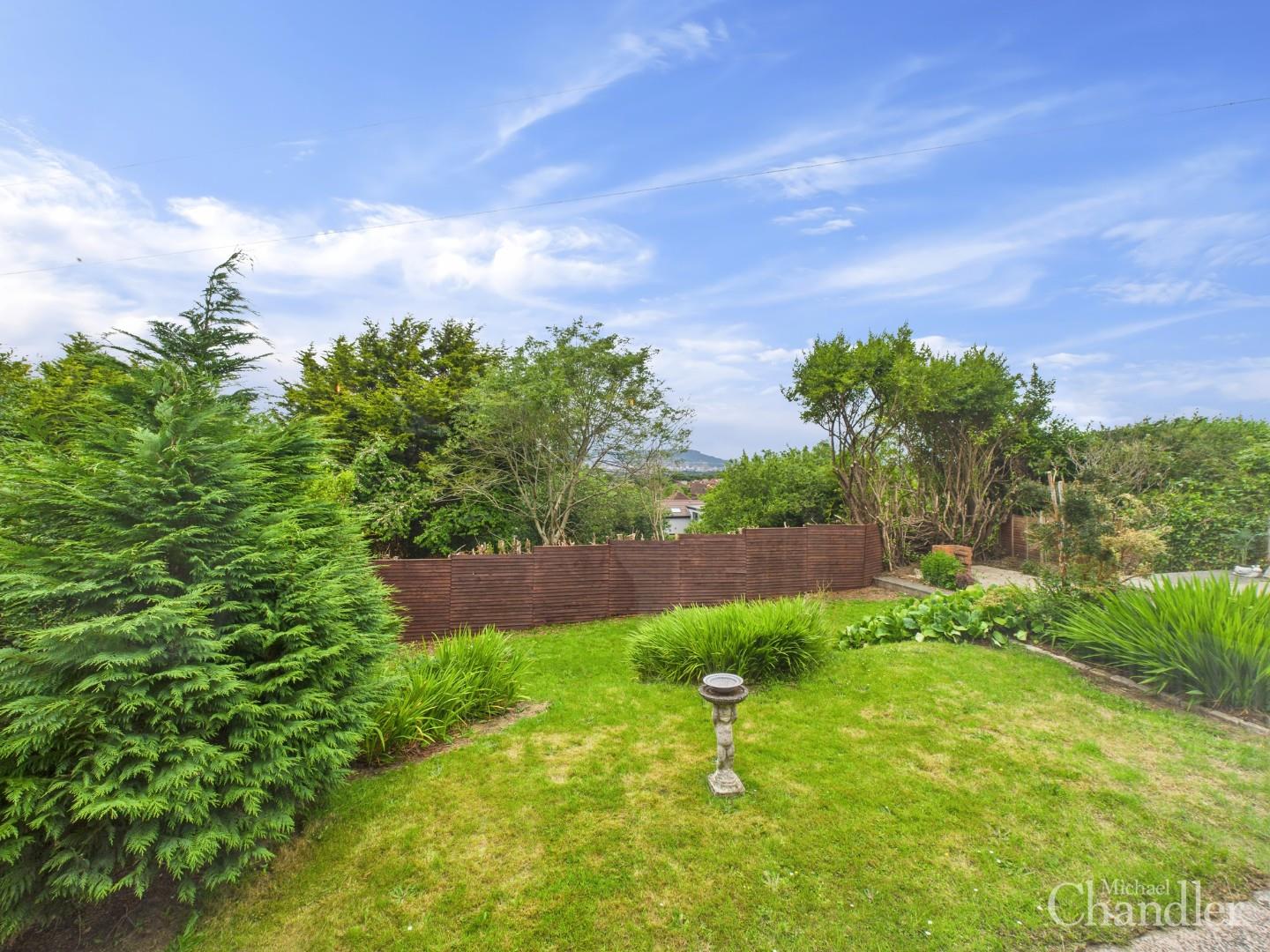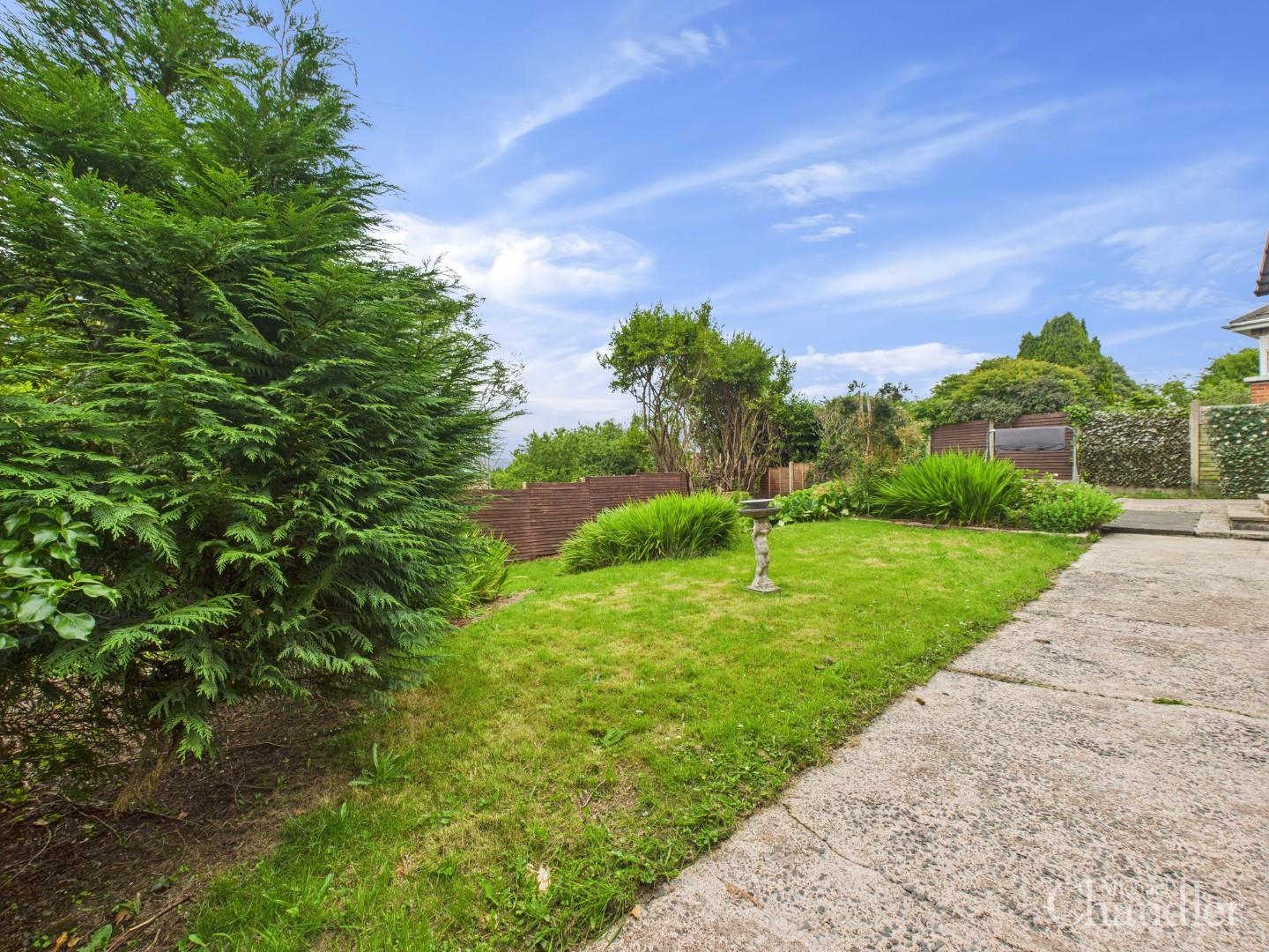 Spacious rear garden laid in lawns with a patio areas and an array of plants & shrubs