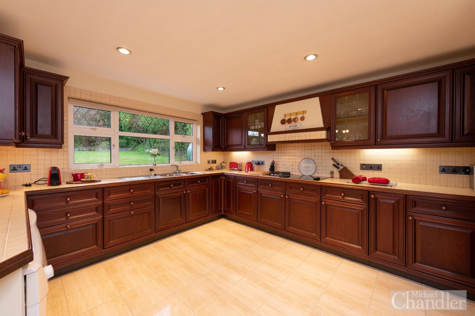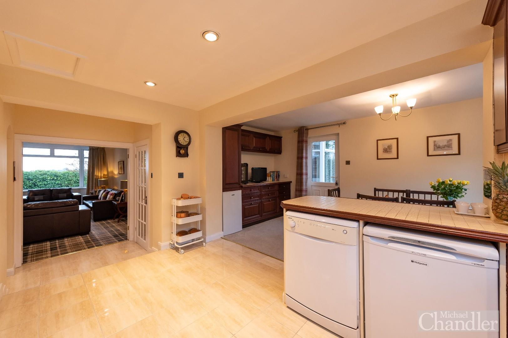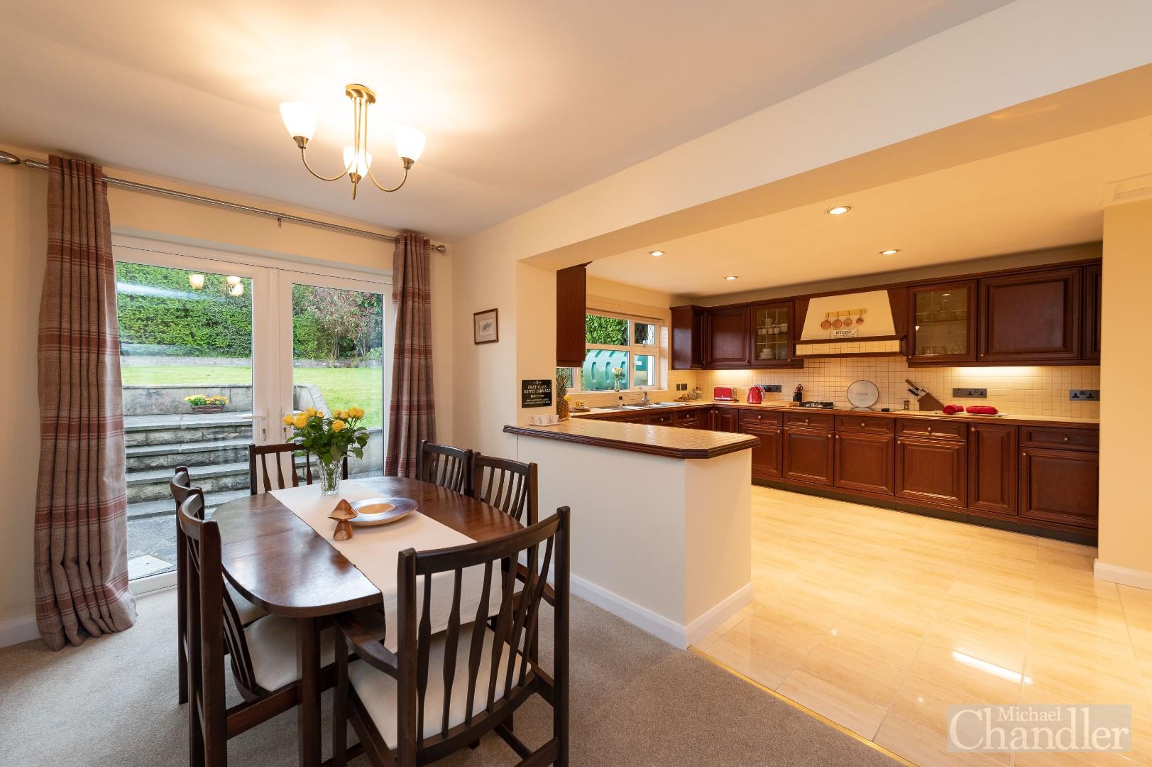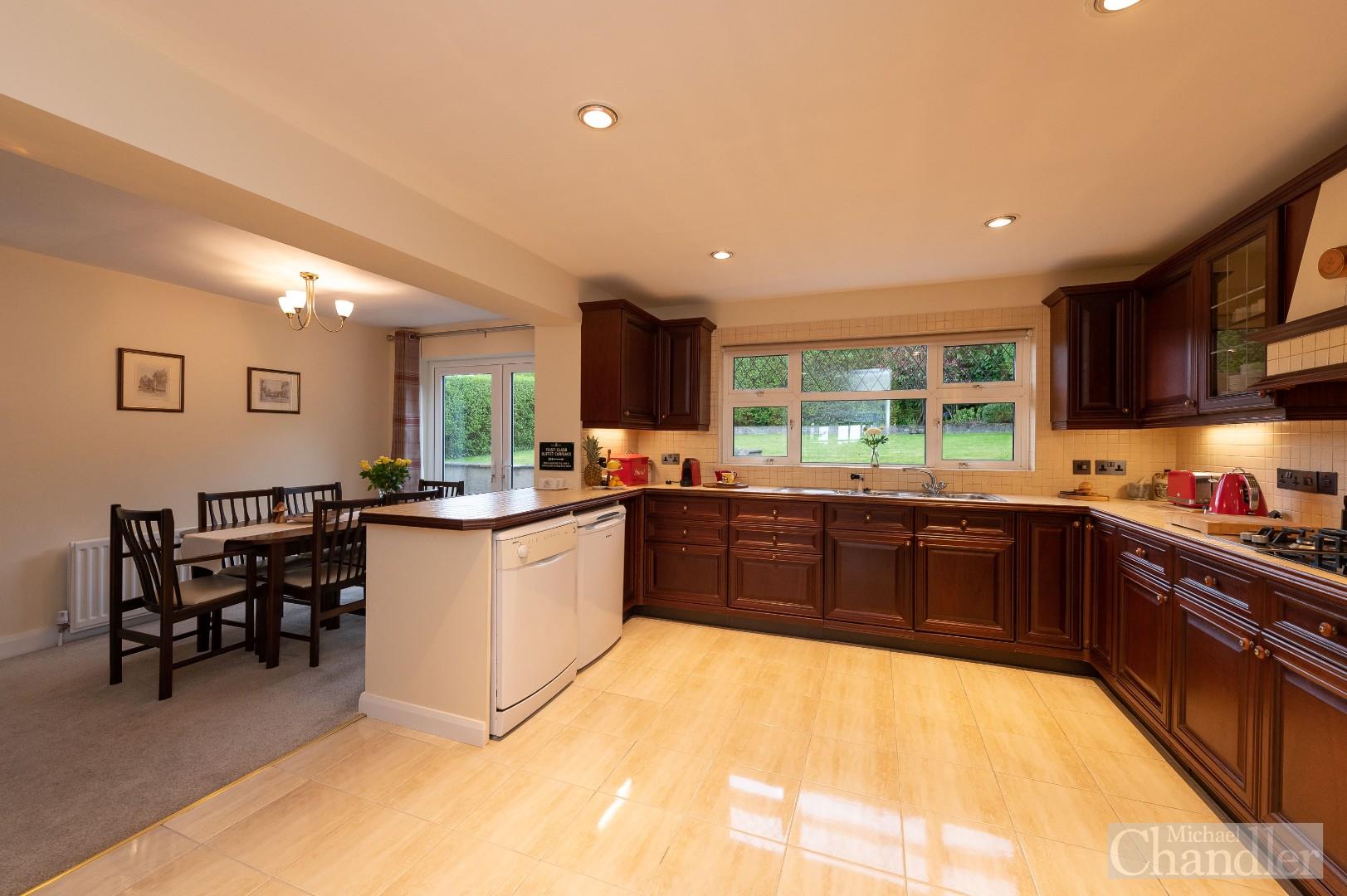 Large well fitted kitchen with an open plan dining area with patio doors to the rear patio
