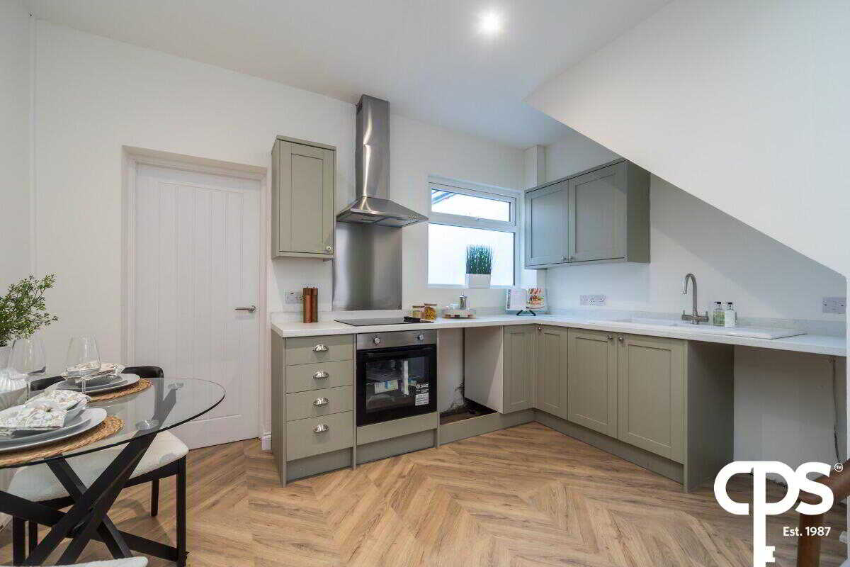 A bright and welcoming open-plan space designed for modern living and entertaining. The newly installed shaker-style kitchen offers a range of high and low units with integrated appliances and ample storage. The room is finished with stylish herringbone flooring and a contemporary feature room divider creating subtle separation from the staircase.