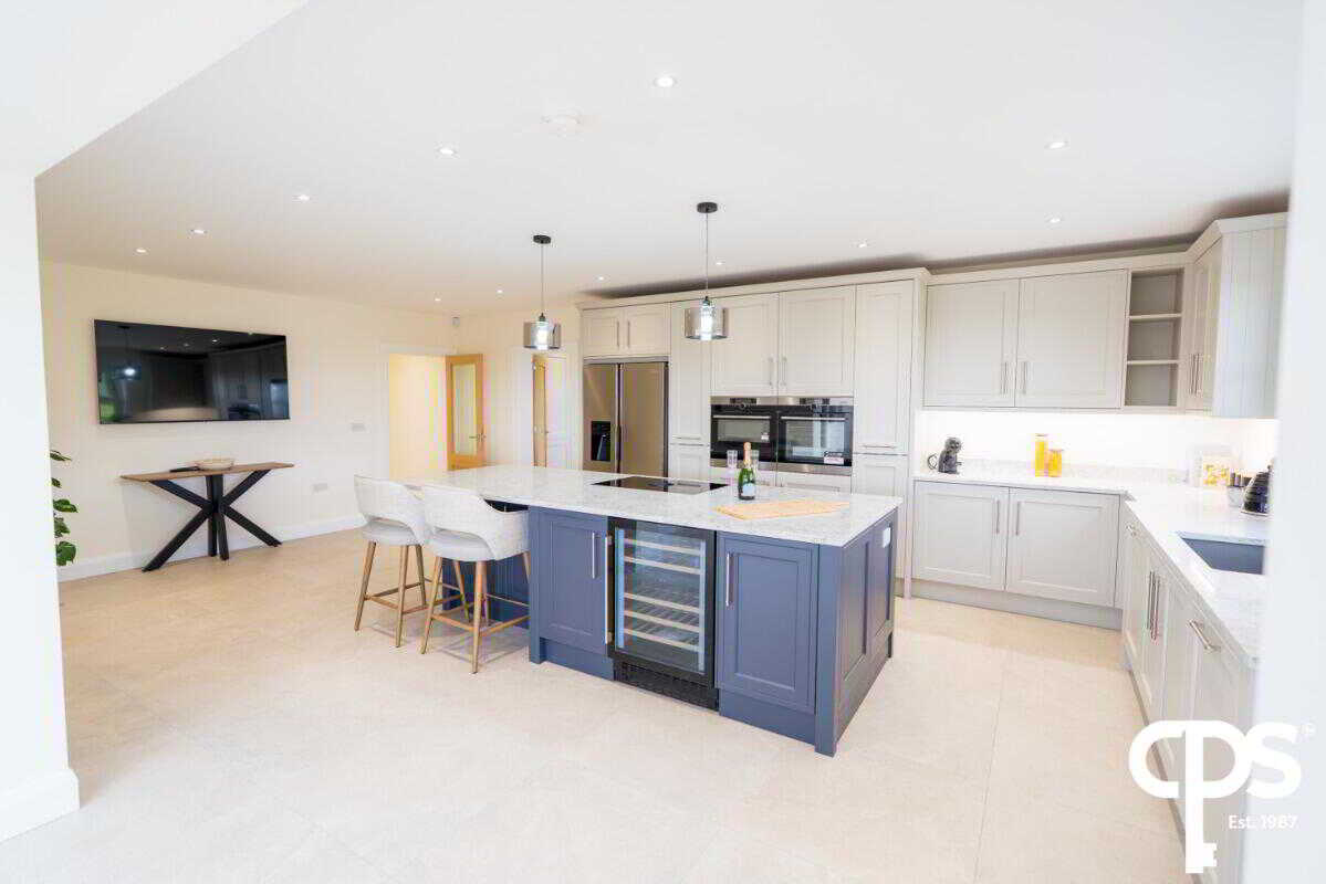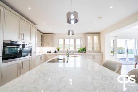 Range of high- and low-level units, quartz work surfaces, sink and drainer, quartz splash back, two pull out larders, double ovens, electric hob, integrated dishwasher, large island.