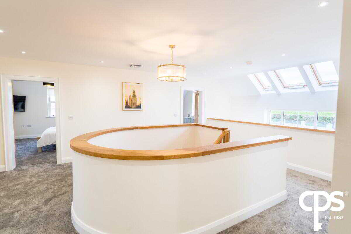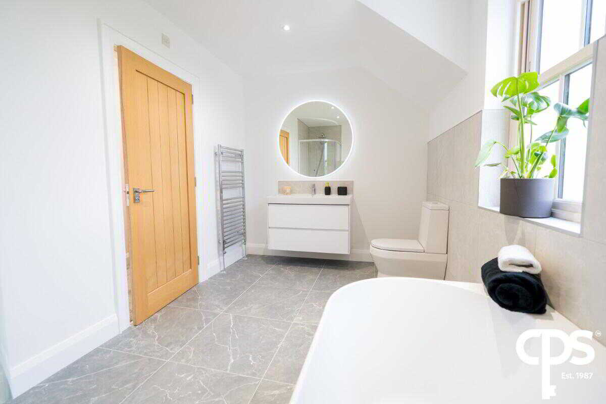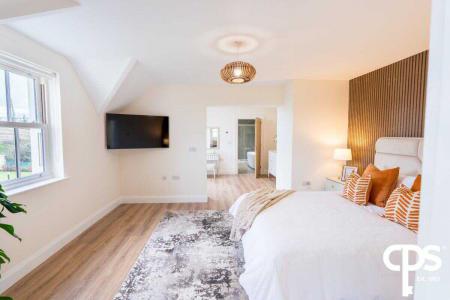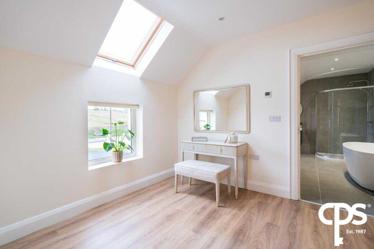 Spacious double room with wooden flooring and neutral décor. The bedroom also boasts an ensuite bathroom and a dressing room. The ensuite is a white suite comprising low flush WC, vanity unit with wash hand basin, fully tiled shower cubicle, free standing bath, part tiled walls, tiled floor, low voltage spotlights, extractor fan, heated towel rail.