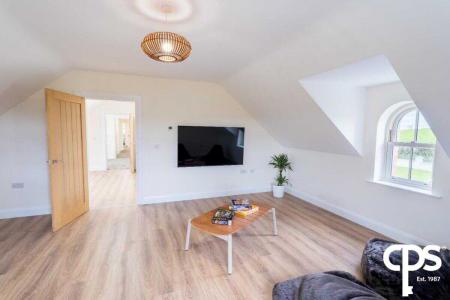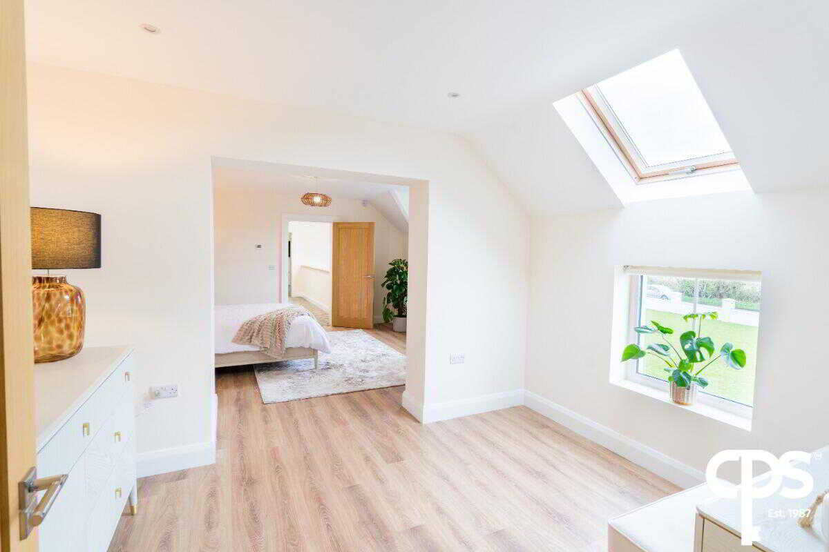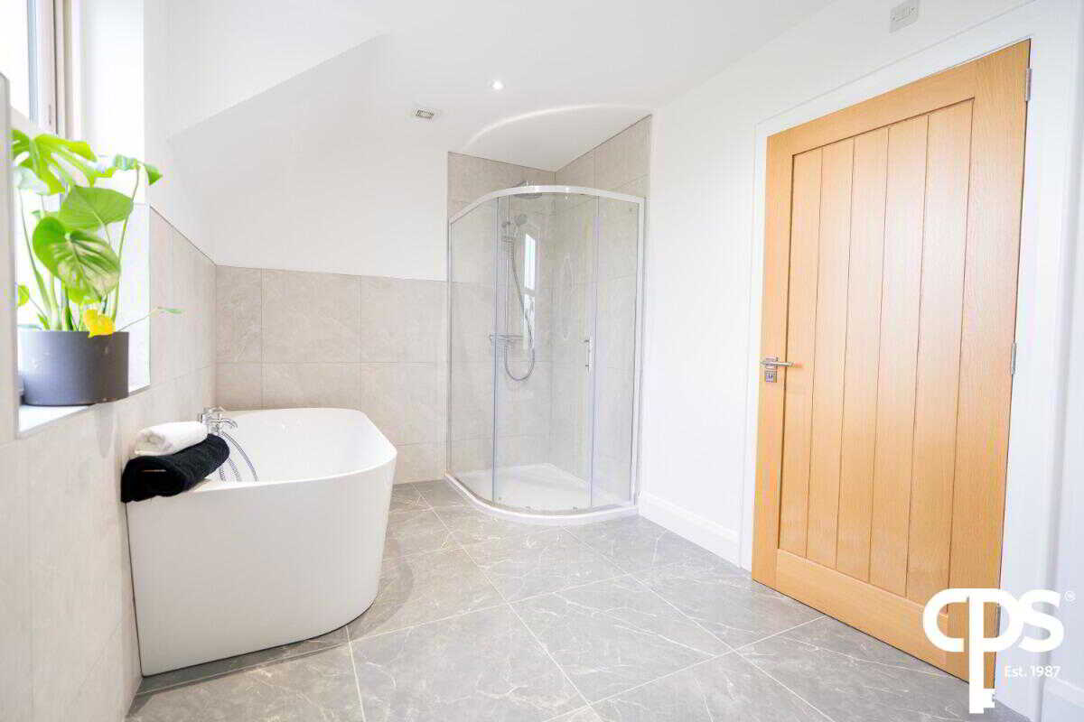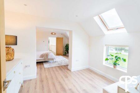 Spacious double room with en-suite comprising of a low flush WC, fully tiled shower cubicle, heated towel rail, part tiled walls, ceramic tiled floor, low voltage spotlights, extractor fan, Velux window