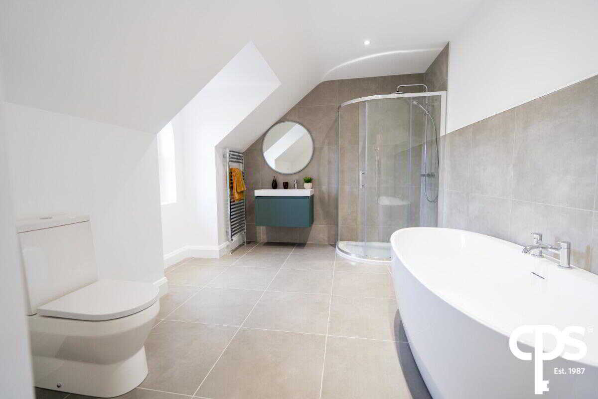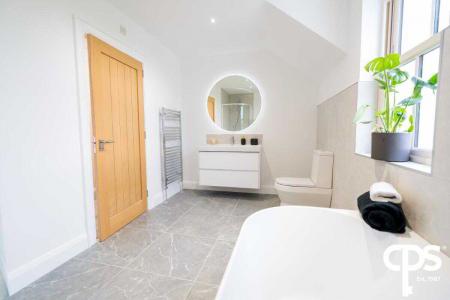 White suite comprising low flush WC, vanity unit with wash hand basin and tiled splash back, fully tiled shower cubicle, free standing bath, part tiled walls, ceramic tiled floor, heated towel rail, low voltage spotlights, extractor fan.
