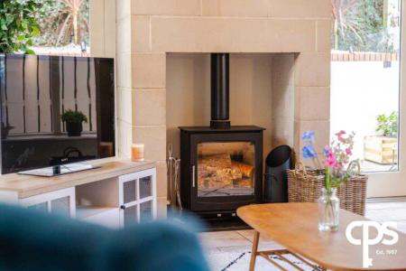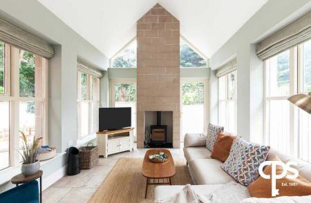 Tiled flooring flowing from the kitchen area with a spectacular 4m high vaulted ceiling and sandstone chimney feature with a wood burning stove inset. The room also gains copious amounts of light from windows each side and French patio doors leading you to the rear.