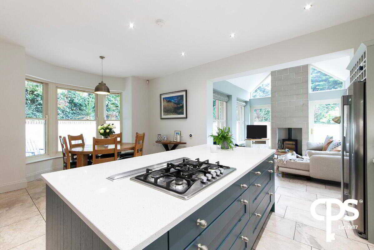 Spacious open plan kitchen area with tiled flooring with a Quartz Island boasting a 5-ring hob and undercounter units built in. The kitchen has Quartz worktops in keeping with the island and units high and low with integrated appliances such as; two eye-level ovens, dishwasher and fridge freezer.
