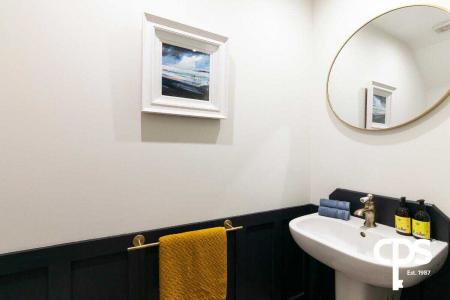 Located in the hallway with half-wall panelling and comprising of a WC and wash hand basin.
