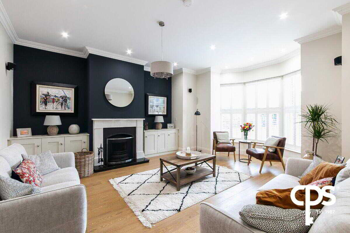 Wooden flooring with a bay window allowing ample amount of natural light complimenting the neutral décor. There is bespoke built in units either side of the fireplace feature of an open fire, marble mantlepiece and granite hearth.