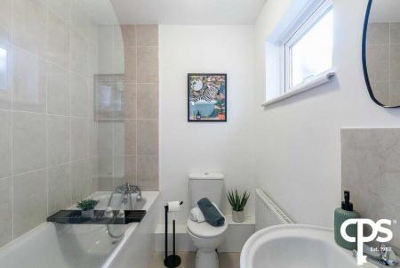 Newly fitted panel bath with shower screen, chrome mixer tap with shower wand attachment, low flush WC, ceramic wash hand basin.