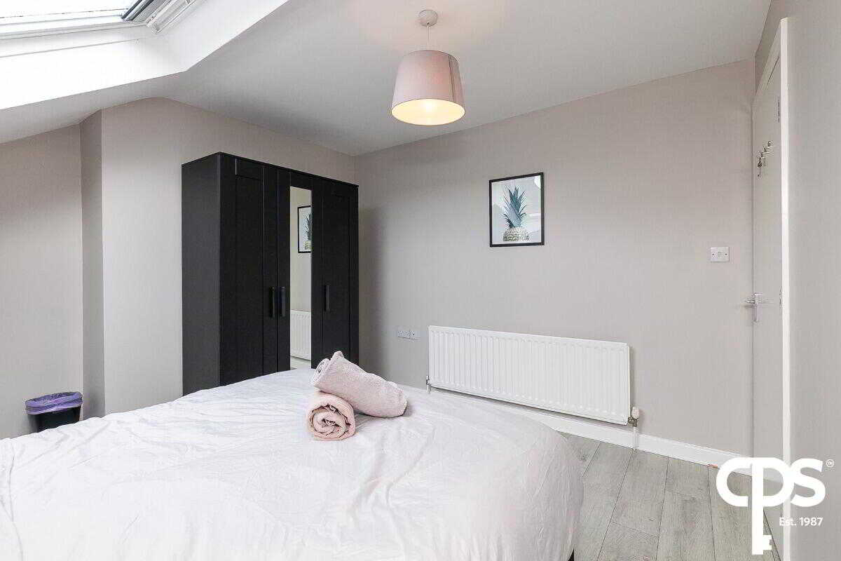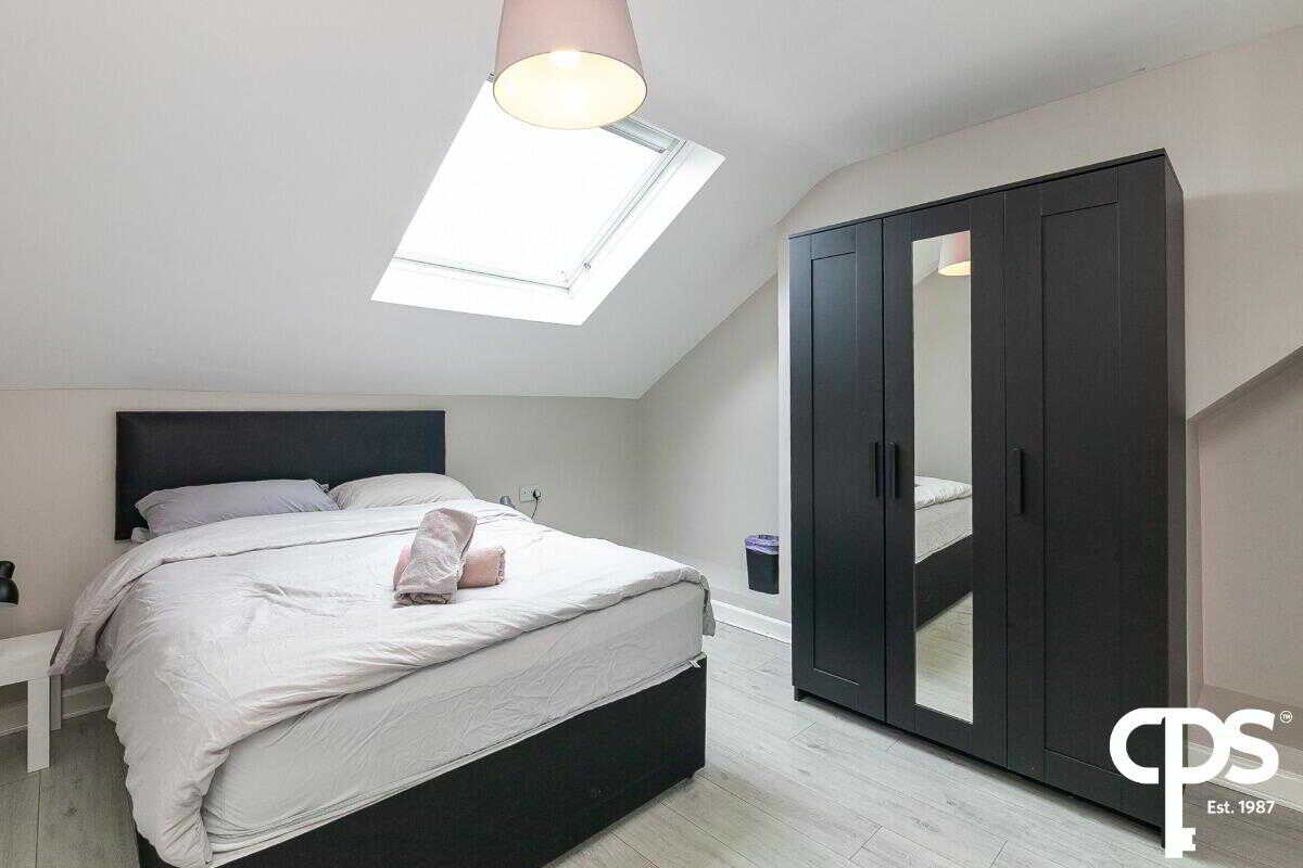Spacious double bedroom with neutral décor and laminate wooden flooring