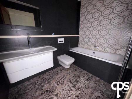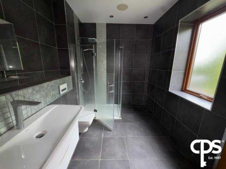 Main bathroom finished with premium tiling, a modern white suite, and chrome fixtures, ensuring both residents and guests have the utmost convenience.