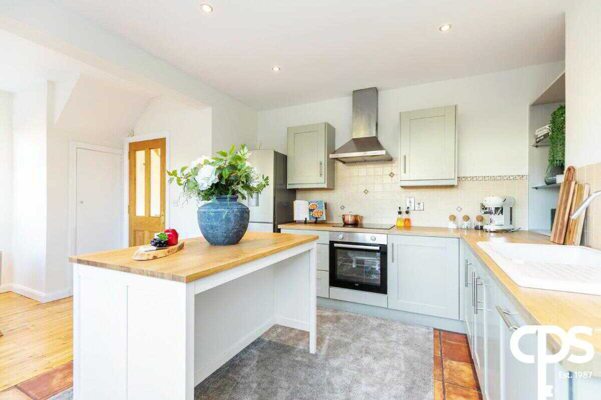 Tile and solid oak strip flooring, range of high and low level units with wood effect worktops, newly installed integrated single oven, integrated four ring hob, brushed stainless steel cooker hood, porcelain sink with drainer, chrome dual lever mixer tap, integrated dishwasher, space for a free standing fridge freezer, partially tiled walls, boiler/storage cupboard, spotlights rear external PVC door leading to the raised decking area and gardens.