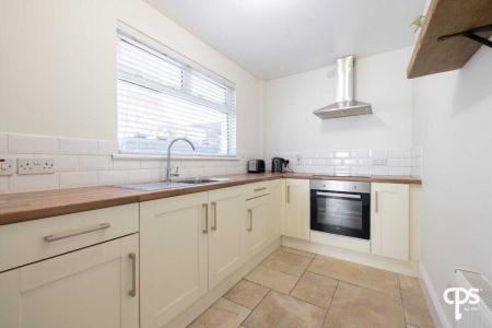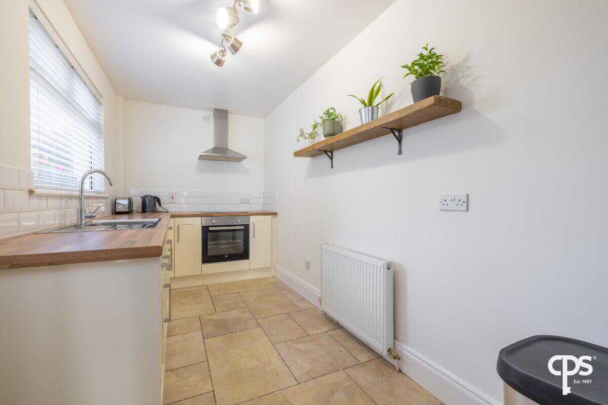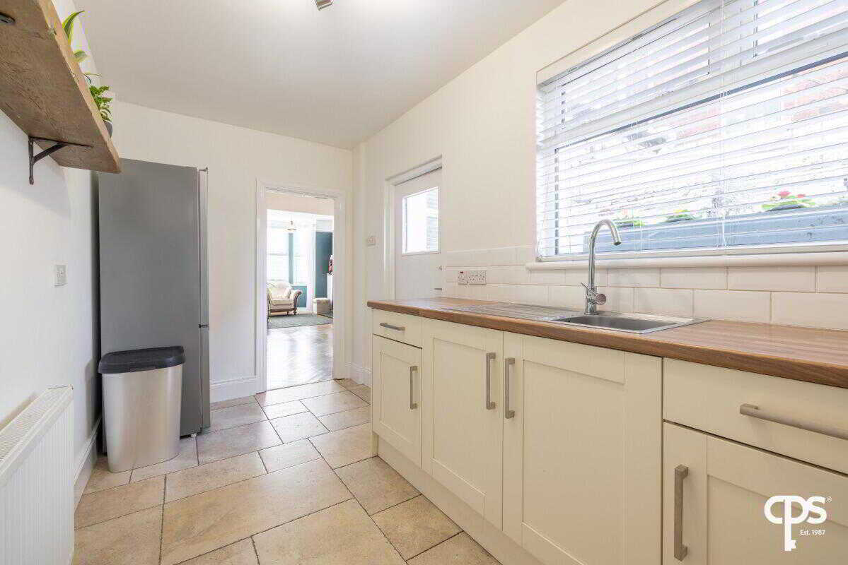 The fitted kitchen is well-appointed with a range of high- and low-level units, providing ample storage and preparation space. The room is finished with tiled flooring and a complementary tiled splashback, offering both practicality and a clean, modern finish. Access is provided directly to the enclosed rear yard, enhancing convenience.