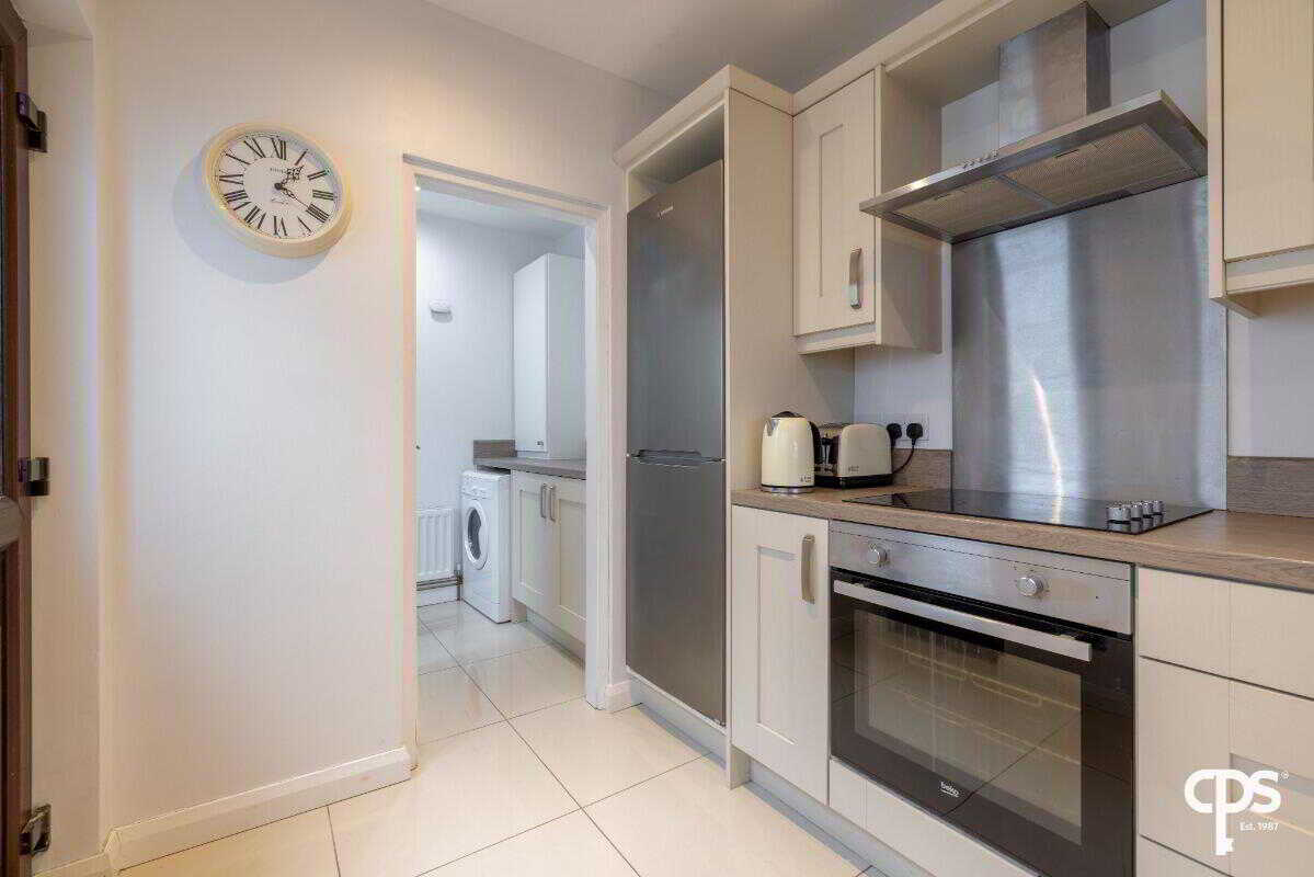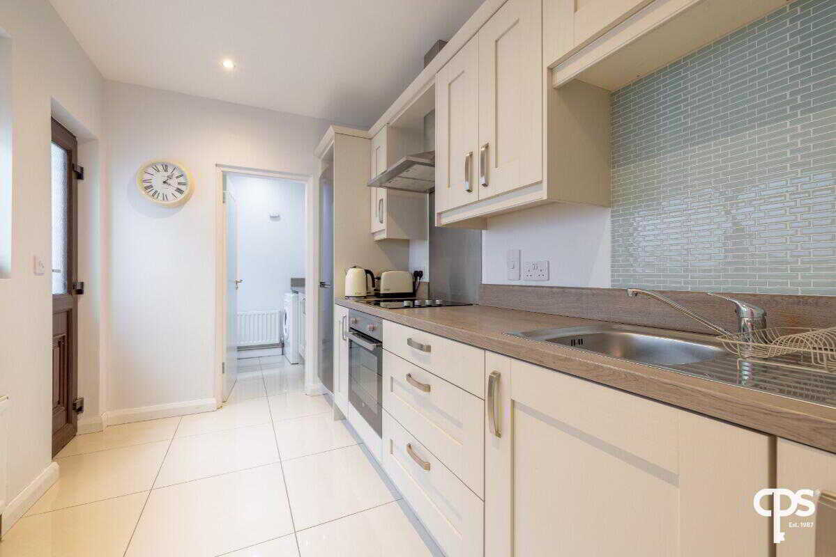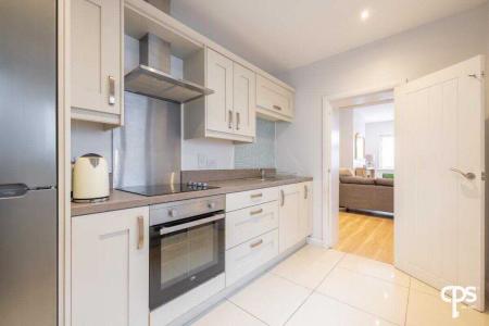 Modern fitted shaker style kitchen finished to a high standard, offering plenty of storage space through high and low units, and ample counter top space, ideal for meal preparation and casual dining. Sleek, contemporary design with a practical layout.