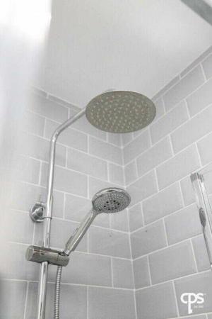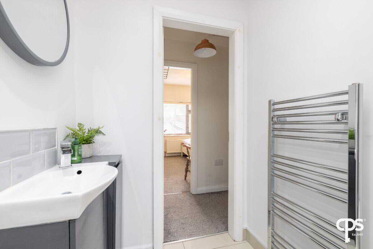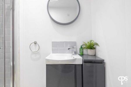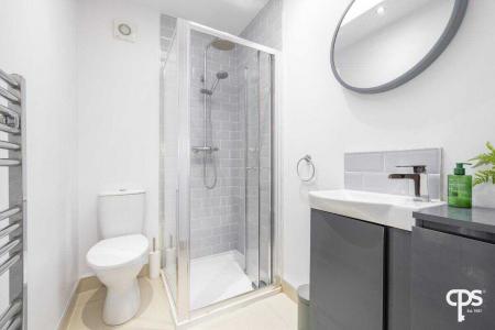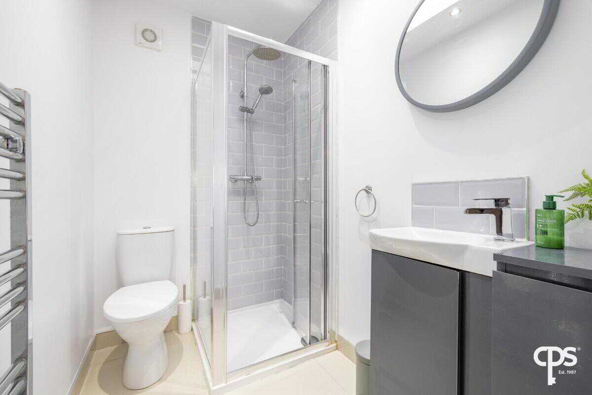 Contemporary bathroom with a modern three-piece suite including shower, WC and sink in vanity. Neutral finishes with stylish touches to include sky light window, spotlights and chrome towel radiator.CUSTOMER DUE DILIGENCE