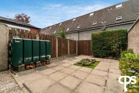 Paved garden area with feature flower bed, mature hedges, oil tank, oil fired boiler housing