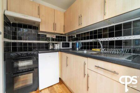 Range of high- and low-level units, Formica worktop, stainless steel sink with drainer, chrome mixer tap, integrated extractor fan
