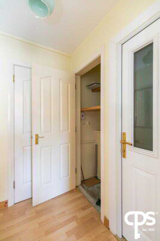 Inner hallway with two large storage cupboards, wood effect laminate flooring, leading to rear entrance porch.