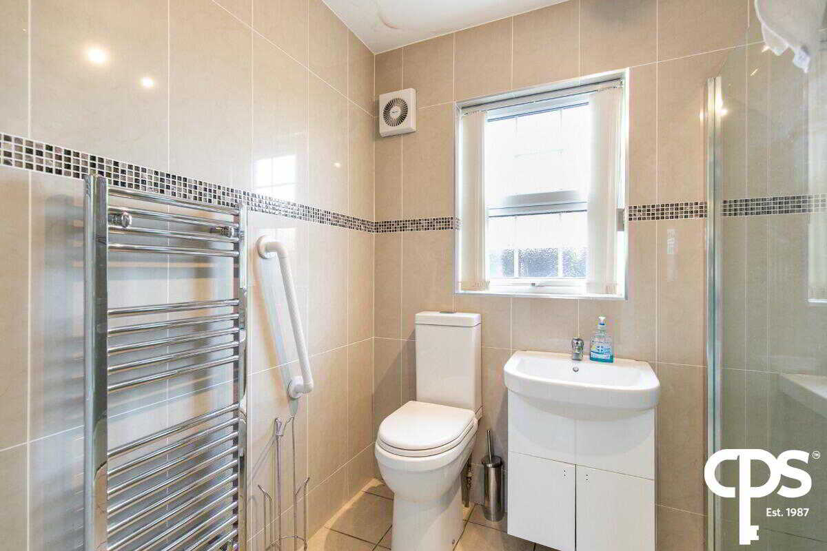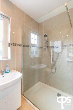 Porcelain floor and wall tiles, free standing toilet, integrated wash hand basin with vanity unit, large walk-in shower enclosure with electric shower, chrome towel heater and extractor fan.