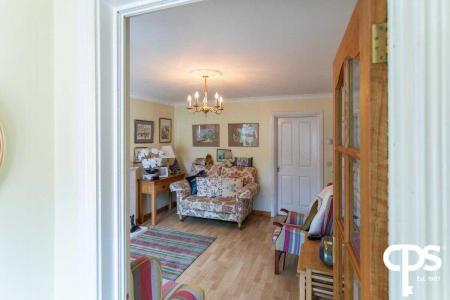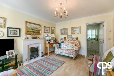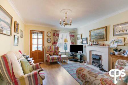 Generous living room with wood effect laminate flooring, feature mantel with electric fire inset, cornicing and neutral décor.