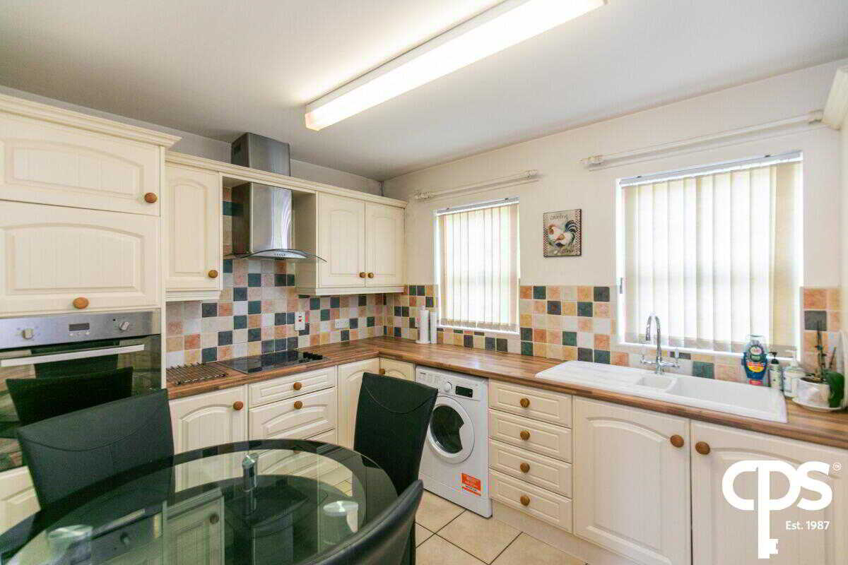 This spacious kitchen area has porcelain tile flooring, along with units high and low, porcelain sink basin and drainer, integrated single oven, four ring ceramic hob, stainless steel extractor hood and neutral décor.