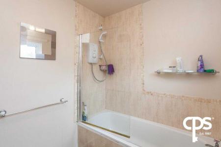 Laminated tile effect flooring, along with a tiled bath surround and a 3-piece suite.