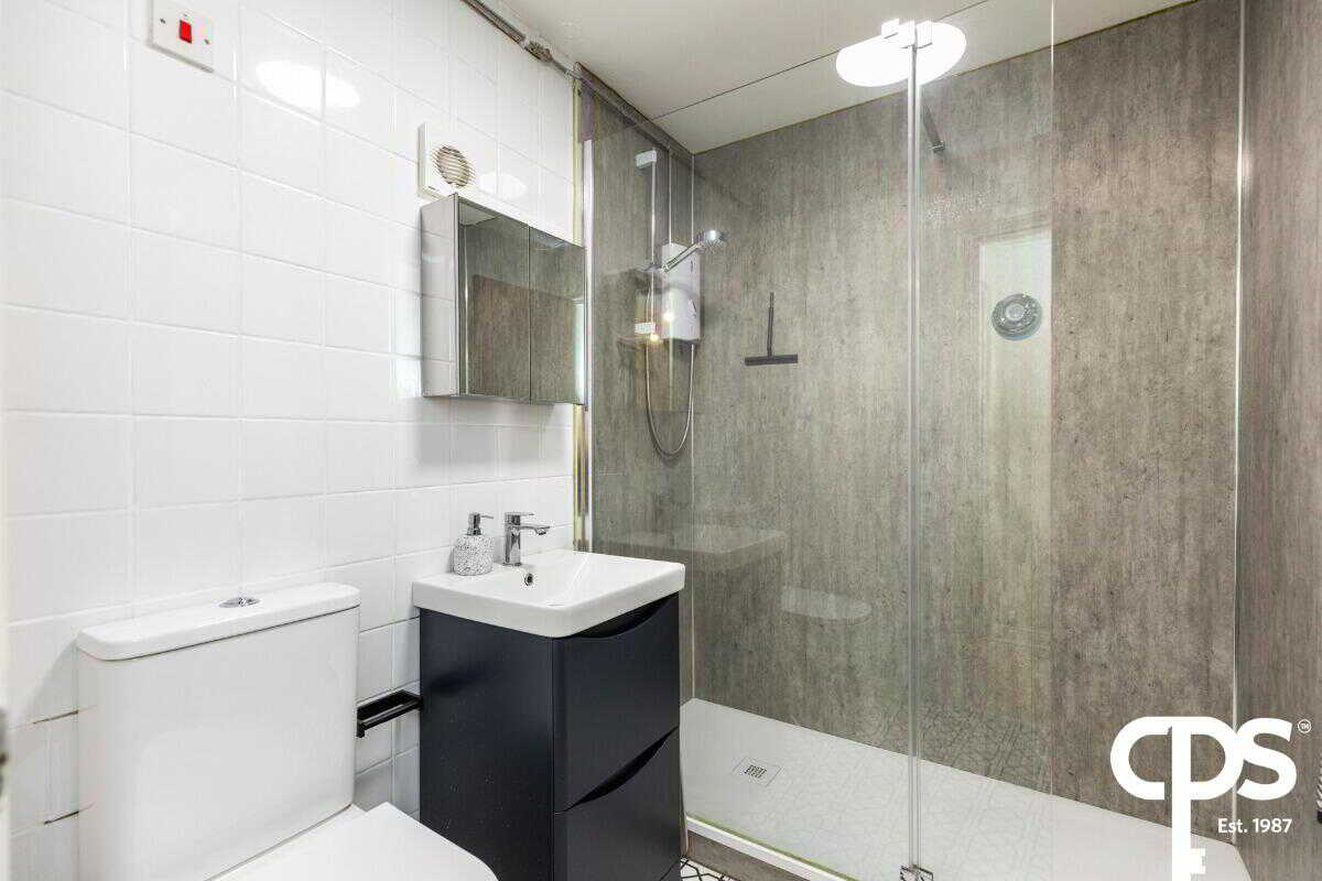 Contemporary bathroom with three-piece suite including wc, sink in vanity and walk in electric shower. Bathroom comprises tiled flooring and surround with a panelled shower surround.