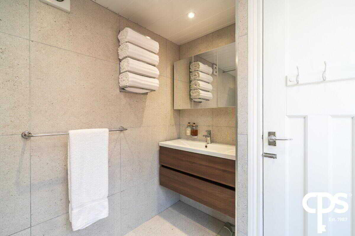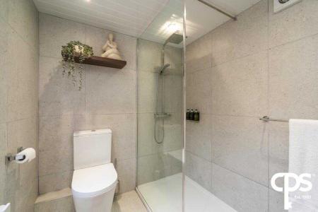 Wall mounted hand basin, tiled walls, enclosed shower cubicle, low flush WC, tiled flooring